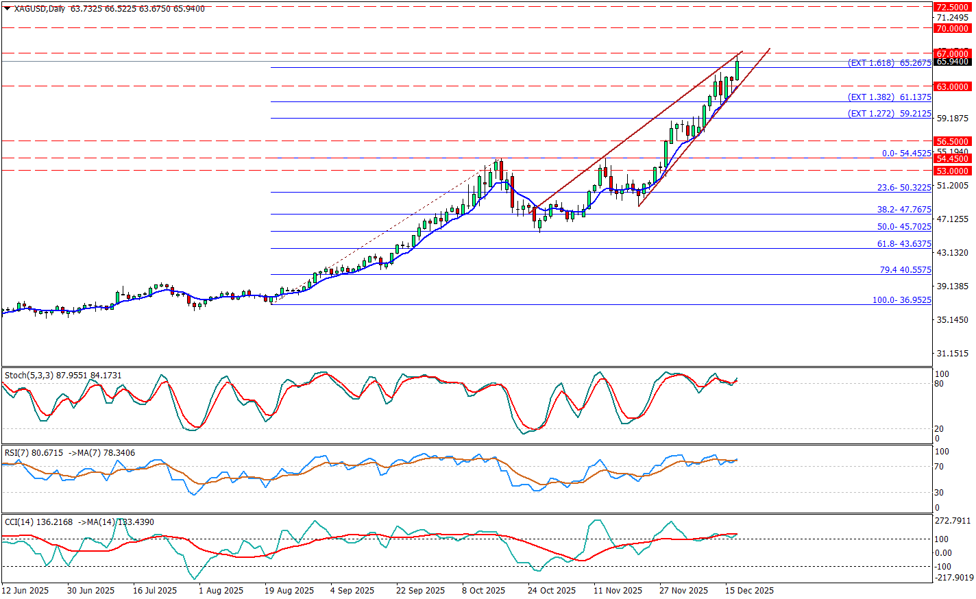 Ons gümüş günlük grafikte ana trend çok net yukarı: fiyat 50–55 bandındaki dirençleri kırdıktan sonra hızlanarak 65/66.50 bölgesine kadar taşmış ve son mumda yüksek volatiliteyle yukarı denemeyi sürdürmeye devam ediyor. Ancak momentum tarafı ısınmış durumda. RSI 80 ve Stokastik 88 aşırı alımda, CCI >100 ise trendin güçlü kalmaya devam ettiğini söylüyor.. Grafikte sağ tarafta çizilen iki yükselen trend çizgisi birbirine yaklaştığı için yükselen kama formasyonuna oldukça benziyor bu formasyon teyit edilirse genelde yukarı trend içinde düzeltme riskini artırır. Teyit için izlenecek şey: fiyatın kama alt bandını ve yakın destekleri kırması. Yukarıda 67.00 ve psikolojik 70.00 bandı bir sonraki direnç bölgesi, kama aşağı kırılmadan bu seviyelere doğru ataklar sürse bile göstergeler nedeniyle “kâr realizasyonu” ihtimalini masada tutmak gerekir.