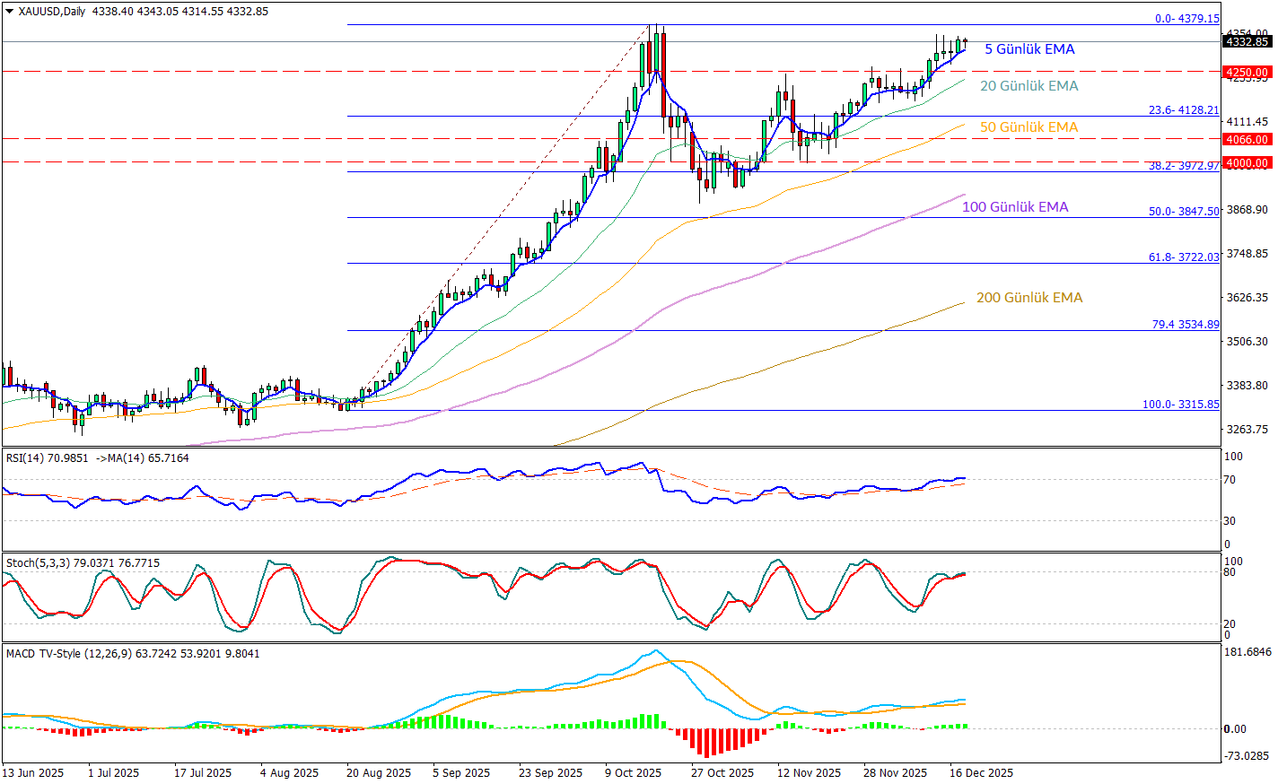 Ons Altın günlük grafikte ana görünüm yukarı yönlü kalmaya devam ediyor: fiyat 5 günlük EMA’nın üzerinde tutunurken, 20 günlük EMA da yükseliş trendinde “dinamik destek” rolünü koruyor. Son yükselişle birlikte 4250 bölgesinin üzerinde kalıcılık sağlanması, alıcıların kontrolü elinde tuttuğunu gösterirken; yukarıda 4379 civarı kısa vadede en kritik direnç alanı olarak öne çıkıyor. Momentum göstergeleri de yükselişi destekliyor: RSI 71 ile aşırı alım bölgesine girmiş durumda ve yukarı eğilimini koruyor; Stokastik 80 seviyelerinde seyrederek yükselişin güçlü ama kısa vadede işaret ediyor. MACD pozitif bölgede ve histogram artıda kalarak trendin hâlen yukarı olduğunu teyit ediyor. Bu çerçevede 4379 direncinin aşılması halinde yukarı hareketin ivmesi korunabilir; olası geri çekilmelerde ise sırasıyla 4250, 4128 (Fibo 23.6) ve 4066–4000 bandı destek bölgeleri olarak izlenebilir.