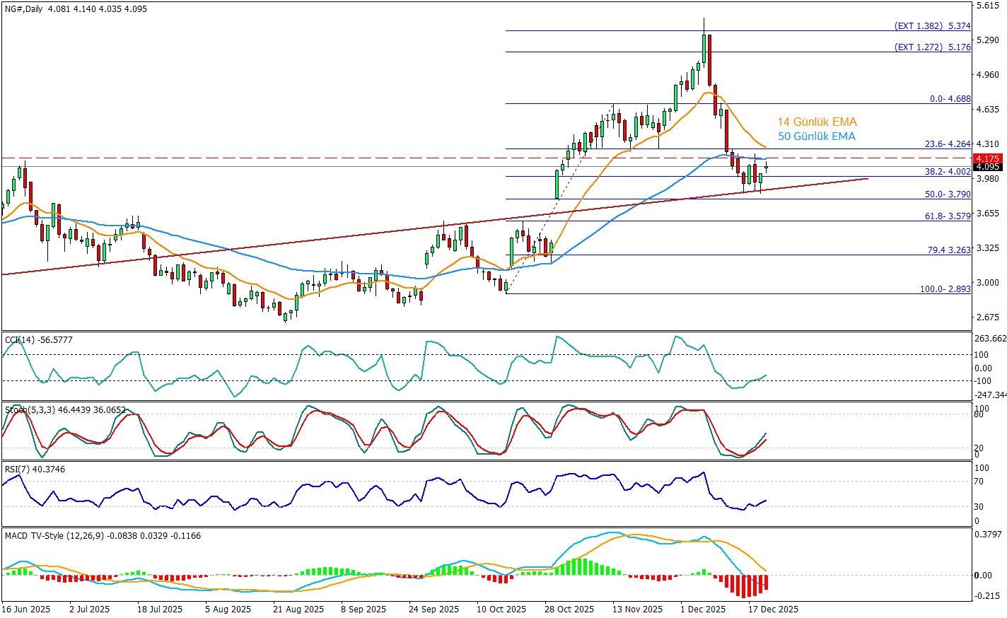 Doğalgazda rekora yakın üretim ve sondaj kulelerindeki artış arz tarafını güçlendirerek yükselişleri sınırlayabilecek bir arka plan oluştururken; elektrik üretimindeki yıllık artış talep tarafında dengeleyici bir destek veriyor. Teknik olarak 4.00–4.26 üzeri kapanışlar gelmedikçe yükselişler “tepki” karakterinde kalabilir; aşağıda 4.00 altı sarkmalarda 3.79 ve devamında 3.58 destekleri yeniden gündeme gelebilir. Göstergeler tarafında ise fiyat şu an 14 günlük EMA’nın altında, ancak 50 günlük EMA’yı test etmeye başladı. Momentum tarafında RSI 40 ve CCI’da toparlanma denemesi var; Stokastik yukarı kıvrılıyor, bu da kısa vadede tepki alımını güçlendirebilir fakat MACD’nin negatif bölgede derinleşmesi satış baskısının tamamen bittiğini henüz teyit etmiyor.