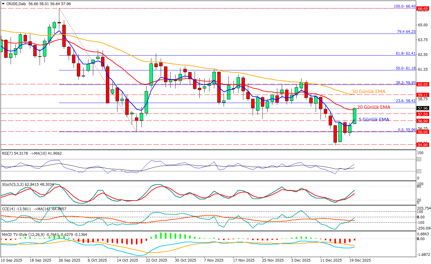 Crude Oil günlük grafikte Eylül zirvesinden (66.40) beri süren alçalan tepe - alçalan dip yapısı korunurken, son düşüşte 54.90 desteğinden gelen güçlü tepkiyle fiyatın yeniden 57.85 bölgesine toparlandığı görülüyor. Tepki yükselişi fiyatı 5 günlük EMA üzerine taşısa da, kısa vadede hâlâ 20 günlük EMA ve 58.40 eşiğinin altında kalındığı için yukarı hareket şimdilik düzeltme karakterinde. Bu bariyerin aşılması halinde 60.00 bandı ana direnç olarak öne çıkıyor. Göstergelerde ise RSI 53 ile 50 üstüne toparlanma, Stokastik’in yukarı kıvrılması ve CCI’ın negatiften sıfıra yaklaşması tepkinin nefes aldığını gösterirken; MACD’nin hâlâ negatif bölgede olması ana trendde satış baskısının tamamen bittiğini teyit etmiyor. Bu çerçevede 58.42 üstü kapanışlar gelmedikçe aşağıda 57.50–56.90 ve 56.00 destekleri izlenebilir.