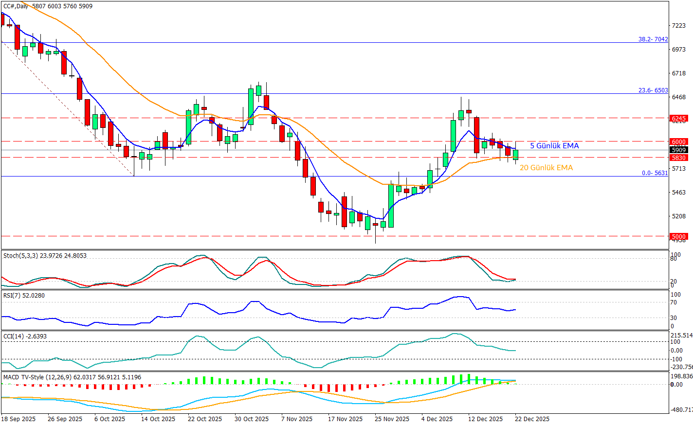 Kakao günlük grafikte Son günlerde 5830–6000 bandında sıkışan fiyat, kısa vadede 5 günlük EMA etrafında yatay seyrederken 20 günlük EMA bölgesi üzerinde tutunma çabası dikkat çekiyor. Bu, trendin tamamen bozulmadığını ama ivmenin zayıfladığını söylüyor. Momentum tarafında RSI 54 ile nötr-pozitif bölgede kalsa da Stokastik 20–30 bandına gerilemesi yükseliş açısından baskı oluşturuyor ancak grafikte hafif yukarı bir kırılım bulunmakta. CCI’nın sıfır çizgisine yakınlaması da kararsızlığı destekliyor. Bu görünümde ilk kritik eşik 6000 seviyesi olarak izleniyor. Aşağı tarafta ise 5830 20 günlük EMA seviyesi fiyatı destekleyen ilk nokta olarak takip ediliyor.