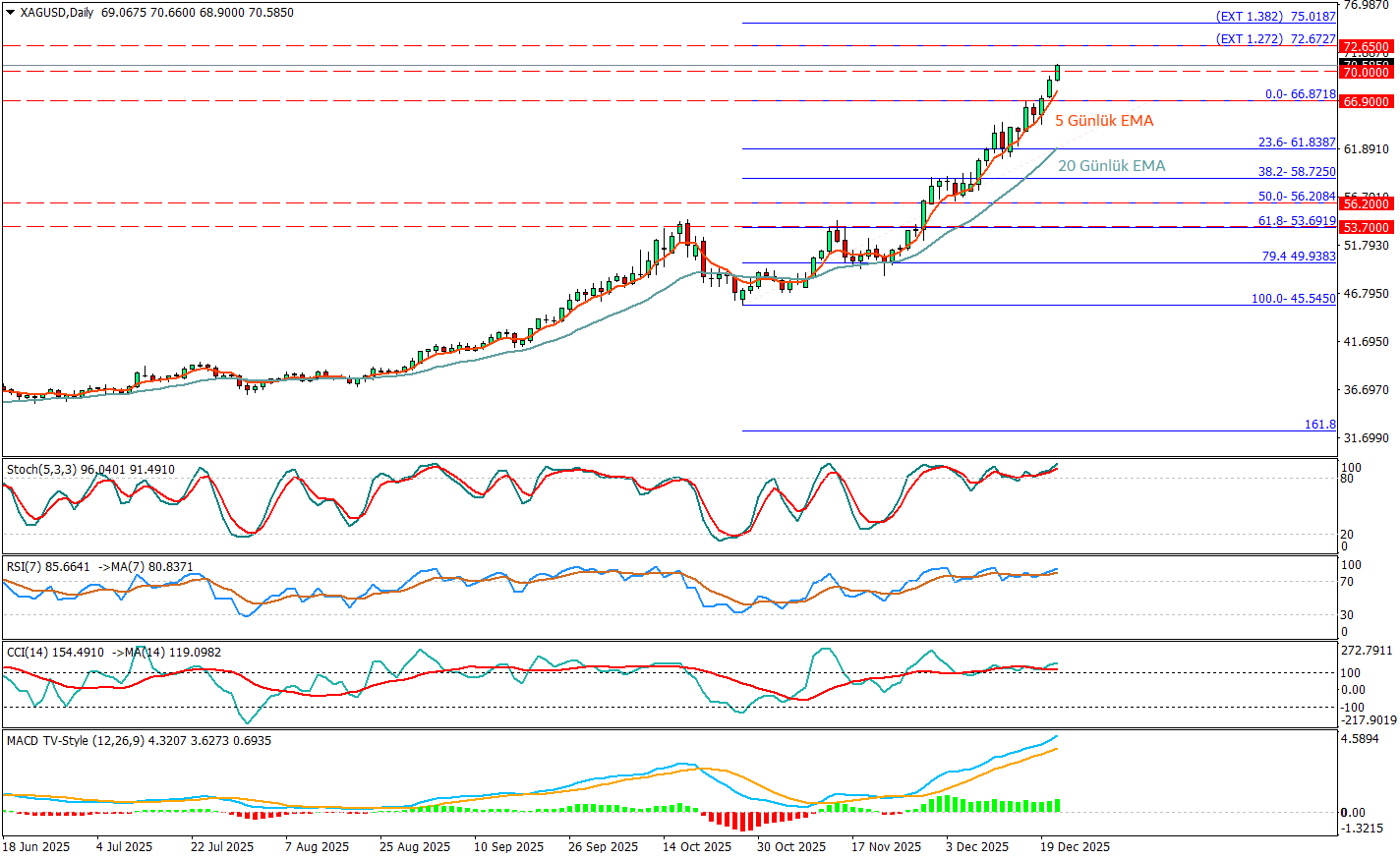 Ons Gümüş günlük grafikte fiyat 5 günlük EMA’nın üzerinde kalmaya devam edip ralliye devam ediyor. Bugün 70 direnci test ediliyor ve yeni zirve 70.66 olarak kayıtlara geçti. Momentum tarafında Stokastik 96 ve RSI 85 ile aşırı alım bölgesi korunuyor ivme güçlü ama kısa vadede soluklanma riski artıyor. CCI 153 ile +100 üzeri “trend momentumu” teyit ederken, MACD pozitif bölgede ve histogram büyüyor bu da yükselişin teknik olarak hâlâ desteklendiğini söylüyor. Olası kâr realizasyonlarında ilk izlenecek bölge 66.90 ve altında 61.85 bandı.