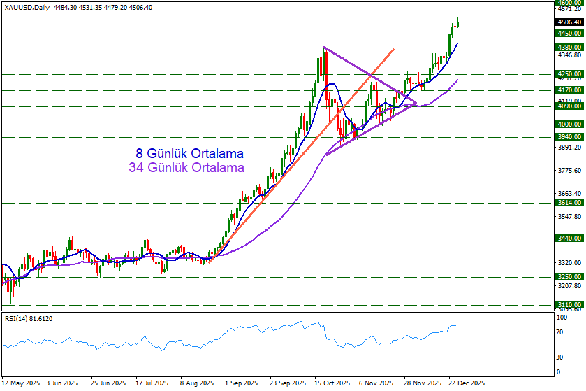 Noel öncesinde 4481 seviyesinde kapanış gerçekleştiren ons altın, haftanın son işlem gününe başlarken Asya seansında yükselişlerine kaldığı yerden devam etti. Fiyatlamalar en yüksek 4531 seviyesini görerek rekor tazelerken, fiyatlamalar şu sıralar 4506 bölgesinde pozitif kalmaya devam ediyor.