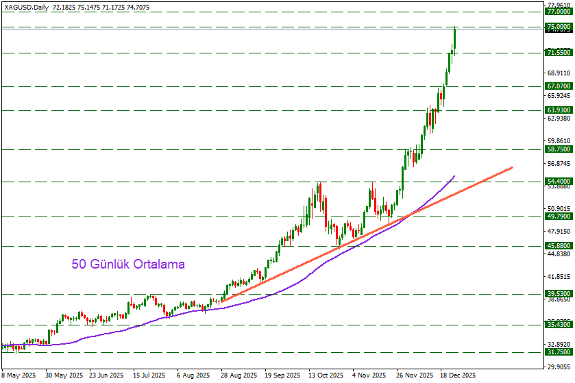 Ons gümüş son 1 aydır sert yükselişlerin etkisi ile 50 bölgesinden 75 bölgesine kadar ciddi bir yükseliş gerçekleştirdi. Haftanın son işlem gününe 72.18 seviyesinde giriş yapan ons gümüş, Asya seansında 75.14 seviyesine kadar yükselerek rekor tazeledi. Fiyatlamalar 75 bölgesindeki direnci test ederken yükselişlerin devamında tam sayılar psikolojik direnç olarak gündeme gelebilir.