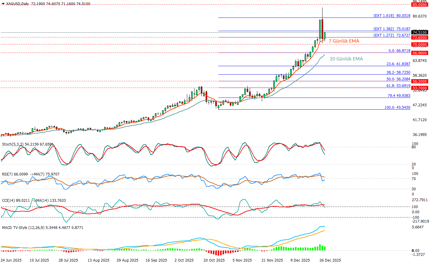 Ons gümüşte dünden bu yana görülen %6,20’lik sert geri çekilme sonrası, bugünkü alımlarla fiyatın yeniden 72$ üzerine toparlanması ve 75$ bandını yeniden test etmeye yaklaşması kısa vadede “düşüşün ardından tepki alımı” senaryosunu öne çıkarıyor. Teknik tarafta fiyat hâlâ yükselen ana yapı içinde kalmakla birlikte, geri çekilme sonrası 7 günlük EMA çevresinde yeniden tutunma çabası dikkat çekiyor. Yukarıda 72 $ üzerinde tutunma devam etikçe 75.00 direnci kısa vadede kırılabilir çünkü volatilite miktarı günlük ortalama 4.5 dolara oynayabileceğini gösteriyor. Göstergelerde momentum tamamen bozulmuş değil: RSI 65–66 bandında kalıp aşırı alımdan gevşerken trend gücünü koruyor, MACD pozitif bölgede yükseliş eğilimini sürdürerek orta vadeli görünümü destekliyor ancak Stokastik’in dalgalı seyri (geri çekilme sonrası) kısa vadede oynaklığın sürebileceğine işaret ediyor. Olası kâr satışlarında ise 70$ önemli bir destek seviyesi olarak takip edilebilir.