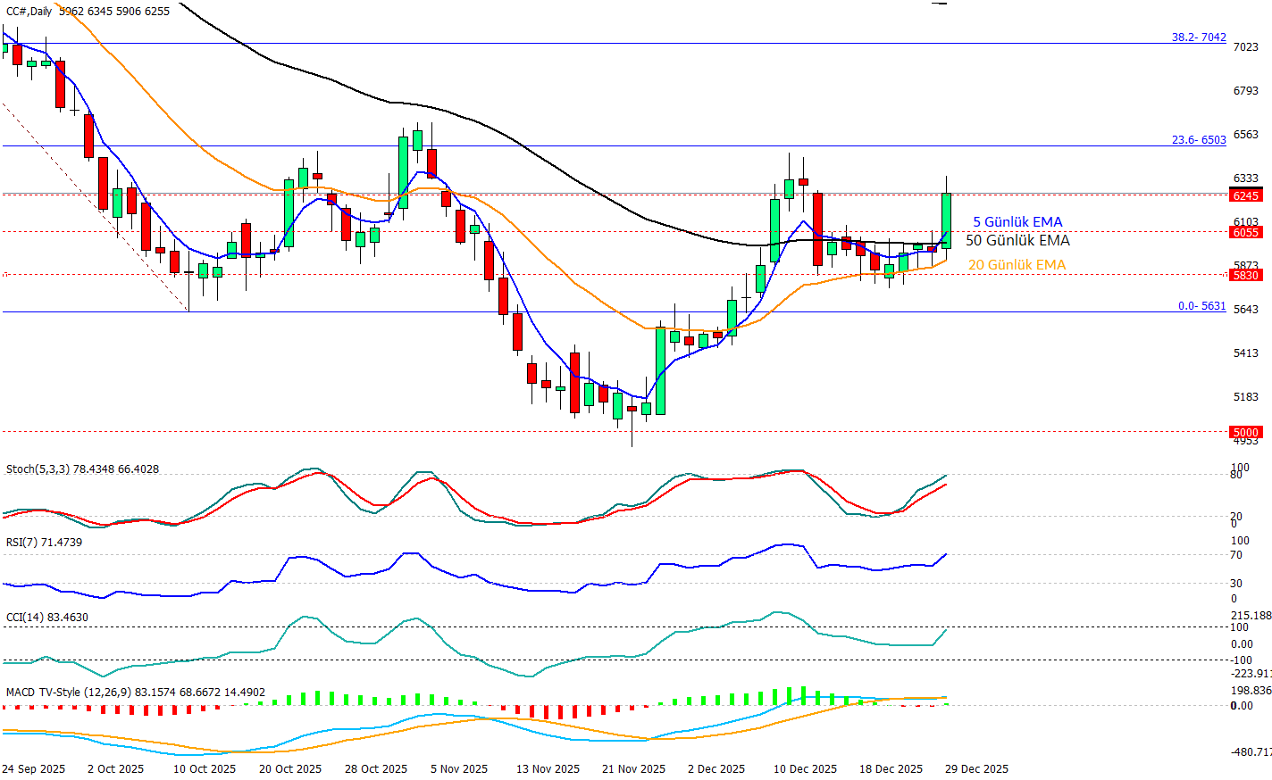 Kakao fiyatlarında son mumda görülen %4,9’luk yükseliş, kısa vadede tepki alımlarının güçlendiğine işaret ediyor. Bu hareketle birlikte 5 günlük EMA’nın 50 günlük EMA’nın üzerine çıkması, kısa vadeli momentumu destekleyen önemli bir teknik sinyal olarak öne çıkarken; 5–20–50 günlük ortalamaların birbirine oldukça yakın seyretmesi piyasanın hâlen kısmi bir konsolidasyon/kararsızlık evresinde olduğuna da işaret ediyor. Yukarıda 6245 bandı ilk kritik direnç olarak izlenirken, bu direnç kırılırsa sonrasında 6500 ve devamında 7040 seviyeleri gündeme gelebilir. Göstergeler tarafında RSI’ın 70 bandı üzerinde kalması ve Stokastik’in yukarı eğimi yükselişi desteklerken, MACD’nin pozitif bölgede olması yükseliş için pozitif bir görünüm veriyor ancak gerek RSI’ın 70+ durumu gerek MACD’nin pozitif bölgede olmasına rağmen yatık görünümü kısa vadede direnç bölgelerinde dalgalanma riskinin de arttığını gösteriyor.
