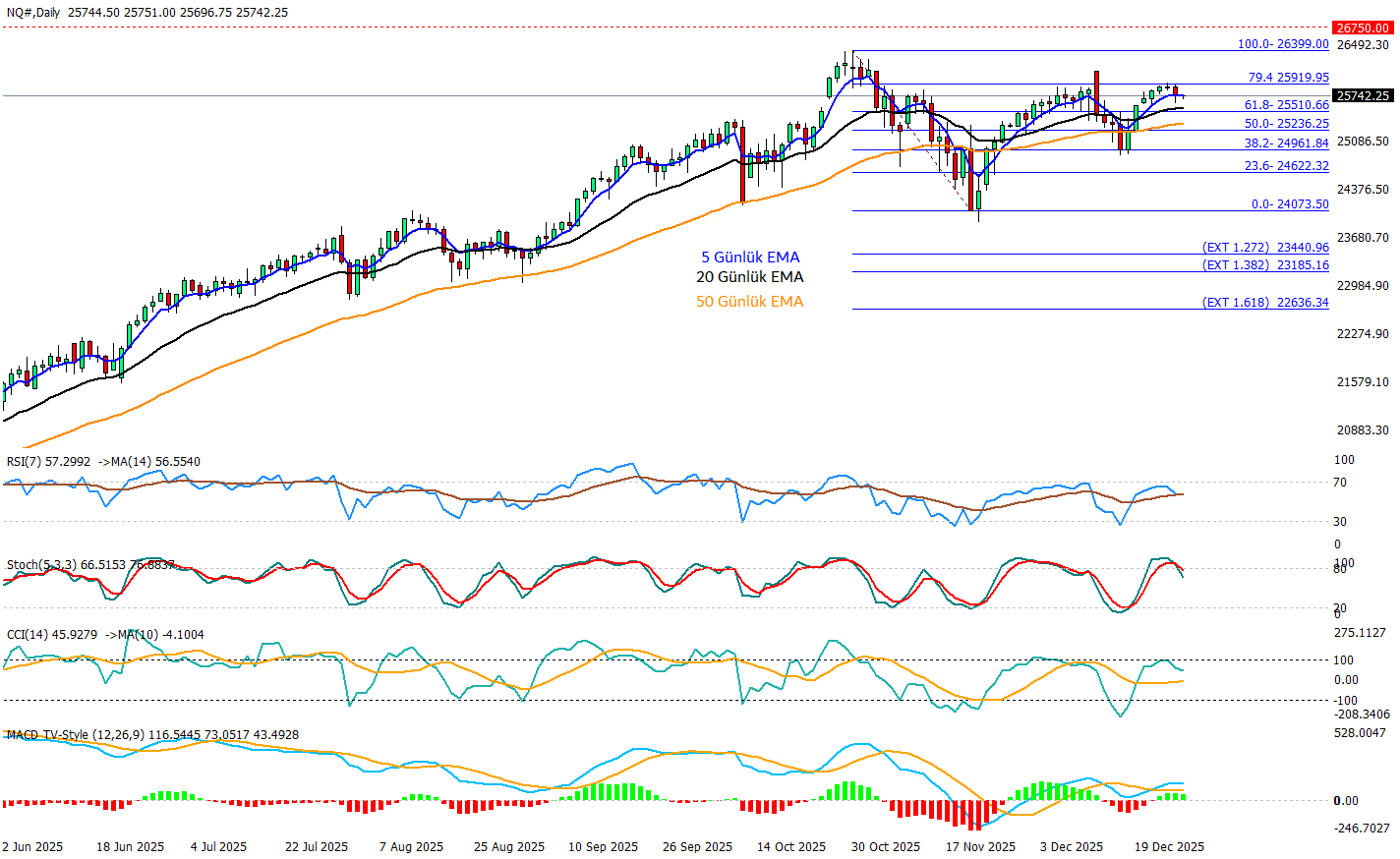Nasdaq vadeli günlük grafikte ana görünüm yukarı trend içinde devam ediyor. Fiyatın 25.746 civarında seyrettiği tabloda 5 günlük EMA’nın 20 günlük EMA’nın üzerinde kalması ve 20 günlük EMA’nın 50 günlük EMA’nın üzerinde konumlanması, geri çekilmelerin şimdilik trend içi düzeltme karakterinde kaldığını gösteriyor. Yukarıda 25.920 (79.4) bandı ilk önemli direnç, buranın aşılması halinde 26.400 (100.0) ve devamında 26750 gündeme gelebilir. Aşağıda ise 25.510 (61.8) ilk kritik destek, bunun altındaki kapanışlarda 25.235 (50.0) ve 24.960 (38.2) seviyelerine doğru geri çekilme alanı açılabilir. Göstergeler tarafında RSI 57 ile nötr-pozitif bölgede, Stokastik aşağı kıvrılarak satış baskısının sürebileceğine işaret ediyor. MACD histogramı pozitif tarafta olsa da ivmenin “çok güçlü” değil, daha çok kontrollü toparlanma modunda olduğunu söylüyor.