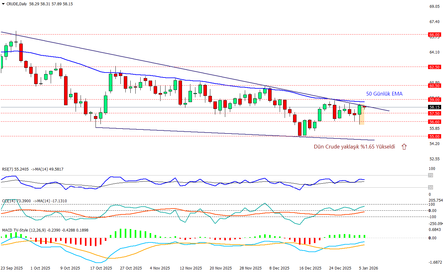 Crude Oil günlük grafikte ana resim hâlâ alçalan trend içinde: Temmuz’dan gelen düşen trend çizgisi fiyatın her yükseliş denemesinde “tavana” dönüşerek net bir dinamik direnç gibi çalışıyor. Ancak dün yaşanan jeopolitik gelişmeler neticesinde Crude yaklaşık %1.65 yükseldi ve alçalan trend çizgi tavanına dayandı ancak bu bölge aşılmadıkça yükselişler daha çok “tepki” niteliğinde kalabilir. Göstergeler ise aşağı momentumun zayıfladığını söylüyor: RSI 50’nin üstünde (pozitif bölgeye geçiş), CCI sıfır üstünde toparlanma sinyali veriyor, MACD tarafında da negatif görünüm yumuşayıp sıfır çizgisine yaklaşıyor (satış baskısı azalıyor).