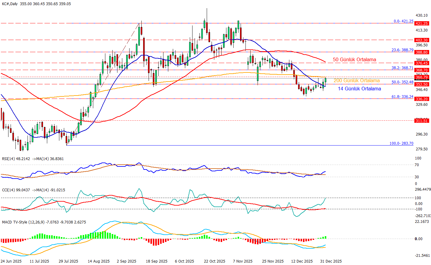 Kahve günlük grafikte Kasım ortasında 421 seviyesini tekrar test ettikten sonra belirgin bir düşüş trendi ile 336 bölgesine kadar geri çekildi. Son günlerde ise dipten gelen tepkiyle fiyat 359 civarına toparlanmış görünüyor. Fiyat şuanda 14 günlük ortalamadan destek bulmuş durumda. 200 günlük ortalama ise direnç olarak fiyatın önünde duruyor. Göstergelere baktığımızda ise RSI 48 ile hâlâ nötr bölgede ama dipten toparlanma görünümünde, CCI 99 ile toparlanmanın güçlendiğine işaret ederken MACD histogramı pozitife dönerek kısa vadeli ivmenin artmaya başladığını söylüyor. Teknik olarak kritik eşik 352.5 (Fibo %50) bu seviye üstünde kalındıkça tepki yükselişinin devamı mümkün, yukarıda ilk önemli bariyer 360–368.7 bandı takip edilebilir eğer fiyat bu bant aralığına yerleşebilirse 368’e doğru ivmelenme artabilir çünkü MACD histogramlarına baktığımızda hali hazırda bir ivmelenme göze çarpıyor 360 seviyesi aşılırsa bu ivme güç kazanabilir ve fiyatı taşıyabilir. Aksi durumda 360 seviyesi 200 günlük ortalama ile bir direnç satış bölgesi olarak öne çıkarsa tekrar 352’ye geri çekilme görebiliriz.