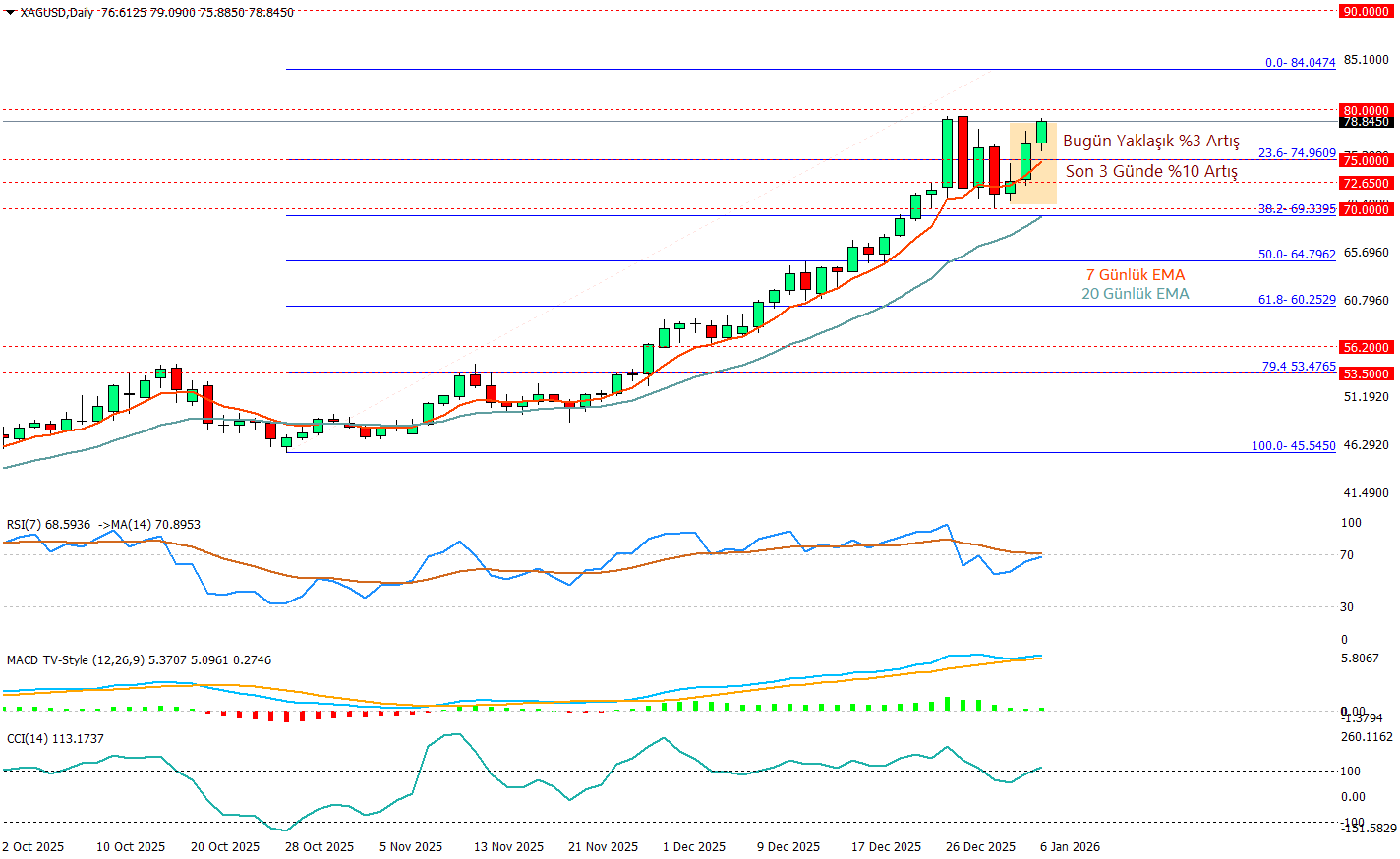 Ons gümüş günlük grafikte kısa vadeli momentumun belirgin şekilde hızlandığı bir görünüm var. Fiyat son 3 günde yaklaşık %10, bugün de yaklaşık %3 yükselerek 75–80 bandına yerleşmiş durumda. Bu hızlı ralli sonrası fiyatın 7 ve 20 günlük EMA’ların oldukça üzerinde kalması trendin güçlü olduğunu gösterse de, aynı zamanda “aşırı ısınma” riskini de artırıyor bu yüzden 80.00 bölgesi psikolojik eşik olarak öne çıkarken, olası kâr satışlarında 75 (23.6 fibo) ilk kritik destek, altında 72.65 ve 70.00 seviyeleri izlenebilir. Gösterge tarafında RSI 68-70 bandında ve yukarı eğimli henüz aşırı alım bölgesine girmemesi fiyatı destekleyici bir faktör olarak okunabilir. MACD pozitif bölgede ve yukarı yönlü, trendin hâlen desteklendiğine işaret ediyor; CCI’nın +100 üzerinde seyretmesi ise yükselişin güçlü ama kısa vadede dalgalanmaya açık olduğuna dikkat çekiyor. Özetle, trend yukarı; ancak 80.00 çevresinde güç kaybı görülürse hareketin sağlıklı devamı için 75–72 bandına doğru geri çekilmeler “normalleşme” niteliğinde olabilir.