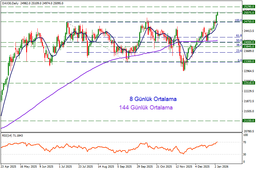 Anlık fiyatlamalar 25075 bölgesinde bulunan direnci test ederken, günlük kapanışın bu direnç üzerinde gerçekleşmesi durumunda bir sonraki direnç bölgesi 25920 olarak test edilebilir. Aşağı yönlü baskıların gündeme gelmesi durumunda ise 24750 bölgesi destek oluşturabilir.
