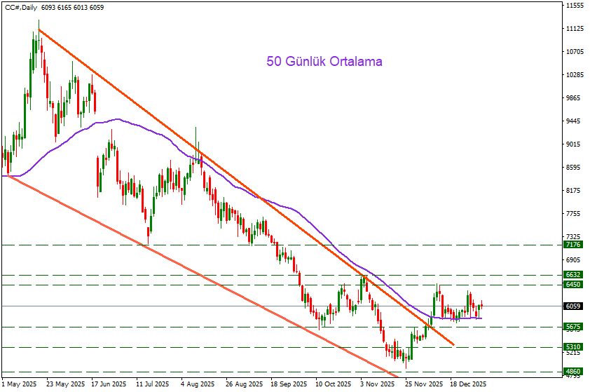 Geçtiğimiz günü 6077 seviyesinde kapatan kakao, bugün 6165 seviyesine kadar yükseliş denemelerinin ardından 6059 bölgesinde işlem görüyor.
