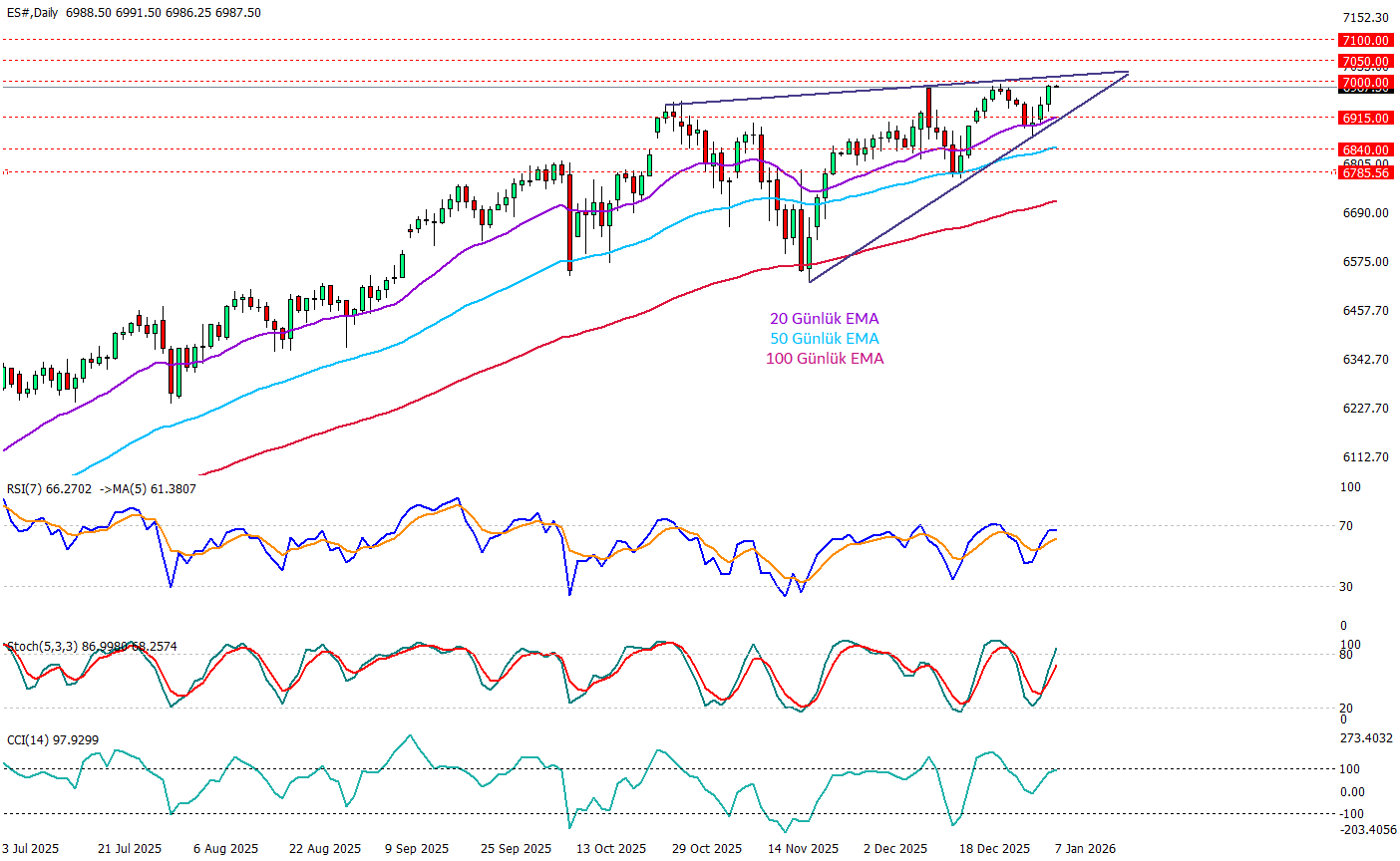 S&P 500 vadelide ana eğilim yukarı yönünü korurken fiyat, iki trend çizgisi arasında sıkışan bir üçgen yapı içinde ilerliyor, alttaki çizgi daha yüksek diplerle alıcıların geri çekilmelerde devreye girdiğini, üstteki çizgi ise yükselişleri sınırlayan dinamik tavanı gösteriyor ve bu sıkışma sonrasında gelecek bir kırılım fiyat momentumunu kırılım yönünde arttırabilir. Endeks 2 Ocak’tan bu yana yaklaşık %1,35 yükselerek yeniden zirve bölgesine taşınmış durumda; şu an 6989 seviyesinde ve gün içinde 6993’lük zirveyi kırmak için çabalaması muhtemel görünüyor. Teknik tarafta 20 günlük EMA üzerinde tutunma ve RSI’nın 66 ile pozitif bölgede kalması momentumu desteklerken, kırılımın başarısız olması halinde ilk etapta 6915 destek bölgesi olarak izlenebilir. Gün içinde yeni zirve gelirse momentum artışı ile birlikte endeks kendini 7000 üzerine taşıyabilir.