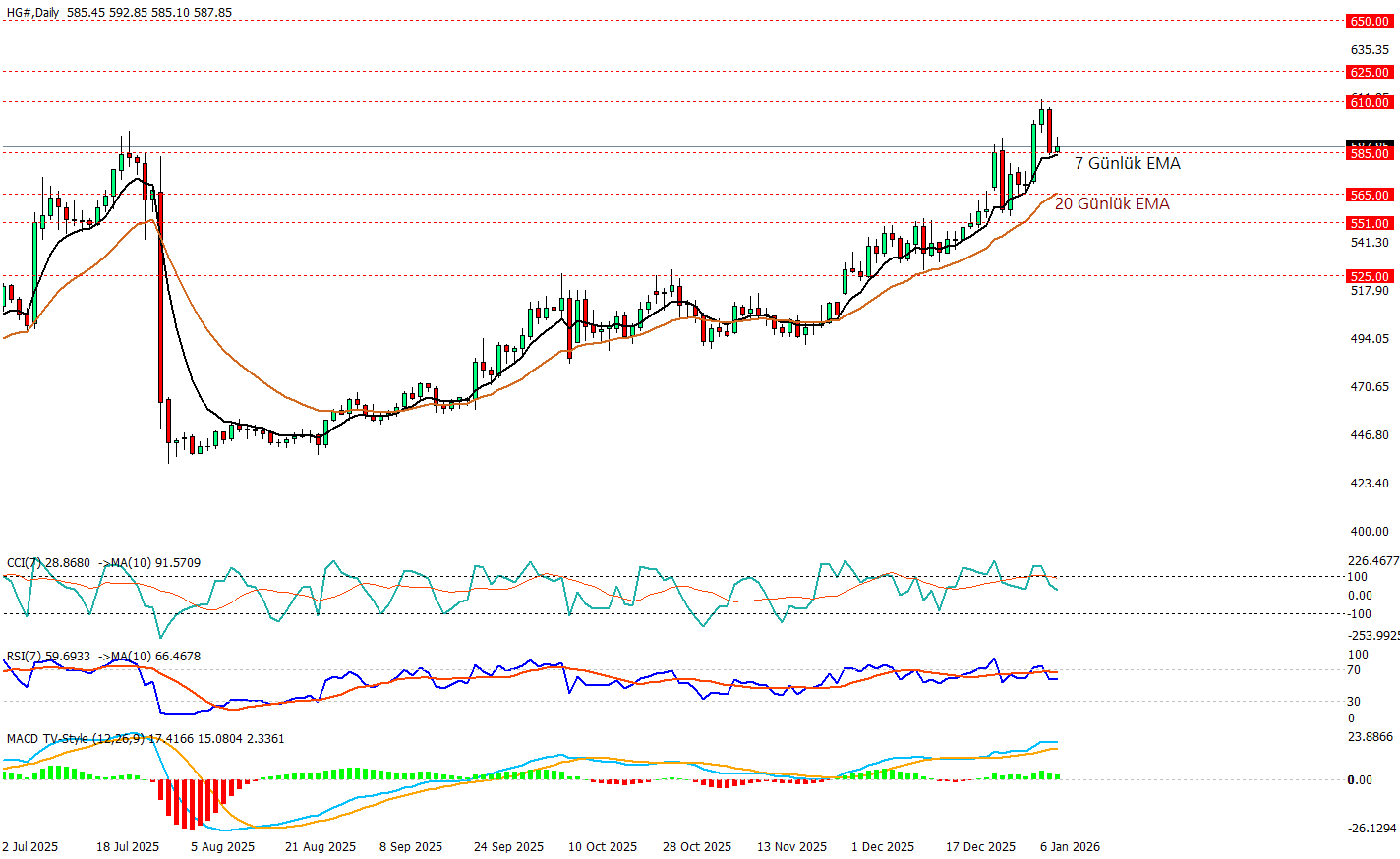 Bakırın günlük grafiğinde ana eğilim yukarı yönde devam ediyor. Fiyat dünkü sert düşüşten sonra 7 günlük EMA’dan tepki alarak yeni güne yükselişle girmeye çalışıyor. 20 günlük EMA ise yükseliş trendini takip eden dinamik bir destek olarak fiyatı takip ediyor. Seviyeler tarafında son atakta 610 bölgesi test edildikten sonra 590 civarına doğru bir kâr realizasyonu görüldü. Bu geri çekilmede 585 (kısa vadeli destek) ve bunun altında 565–551 bandı trendin bozulup bozulmadığını gösterecek ana savunma alanı olarak izlenecek. 585 üzerinde tutunma, trend içi düzeltme senaryosunu destekler. Göstergeler de bunu söylüyor: RSI 61 ile aşırı alımda değil ama güçlü bölgede, MACD pozitif ve yukarı eğimli (trend devamı lehine), CCI ise pozitif bölgede ancak güçsüz bir görünüm sergiliyor. Yukarıda yeniden güçlenmede 610 ilk direnç; bunun üzerinde 625 ve 650 seviyeleri bir sonraki hedef/direnç kümeleri olarak izlenebilir.