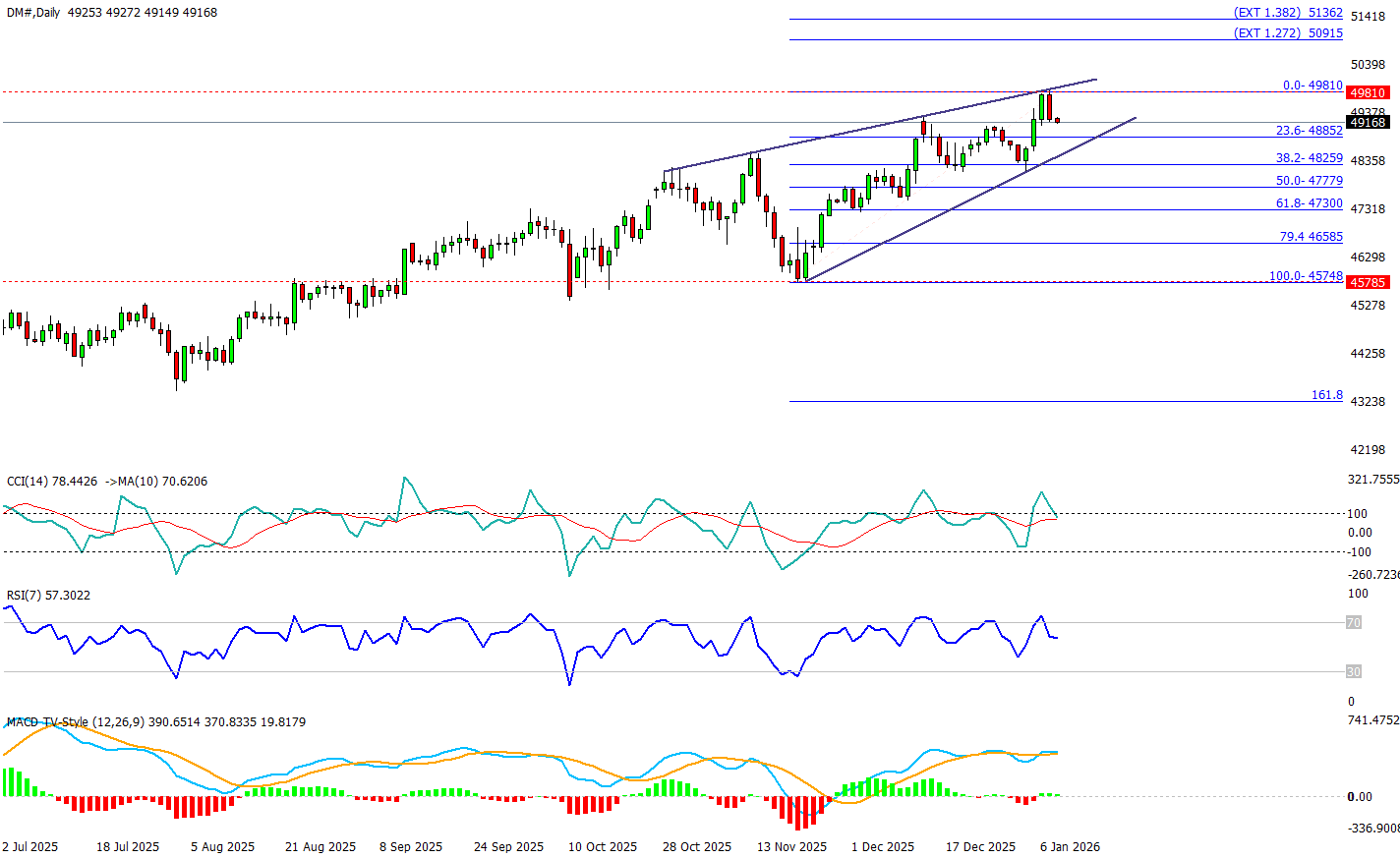 Dow Jones’un günlük grafiğinde ana resim yukarı yönlü bir yapı sergilese de, dün yaklaşık %1’lik geri çekilme son yükseliş dalgasının ardından kar realizasyonu yaptığını gösteriyor. Fiyat, yükselen kanal içinde kalsa da kısa vadede 49.810 civarındaki tepe bölgesinden geri dönmüş görünüyor; bu nedenle aşağıda ilk kritik savunma 23,6 fibo 48.850, bunun altında 38,2 48.260 ve daha derin düzeltmede 50,0 47.780 seviyeleri destek olarak izlenebilir. İndikatörler “momentum var ama coşku sınırlı” diyor: RSI 57 nötr-pozitif bölgede (aşırı alım yok), CCI 79 pozitif tarafta ama 100’ün altında (trend devamına işaret ederken ivmenin aşırı ısınmadığını gösteriyor), MACD pozitif ve histogram yeşil (trend lehine) fakat son barlarda ivmenin yataylaşması, yeni zirveler için “yeniden enerji toplama” ihtimalini hatırlatıyor. Yukarıda tekrar güçlenmede 49.810 yeniden ana direnç; buranın aşılması halinde grafikte işaretli uzatma bölgeleri olan 50.915 ve 51.360 bandı bir sonraki hedef kümesi olarak öne çıkıyor.