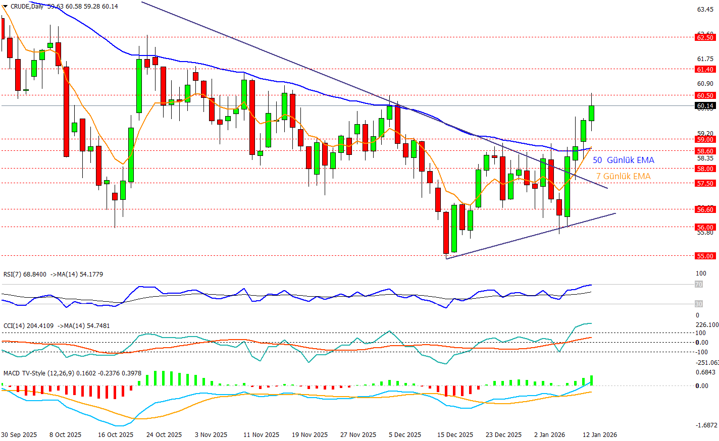 Crude günlükte Aralık ortasındaki dipten sonra toparlanma hızlanırken fiyatın düşen ana trend çizgisini kırıp 59.00/60.50 bandına doğru taşması kısa vadeli görünümü belirgin şekilde iyileştirdi. Özellikle 7 günlük EMA’nın 50 günlük EMA’yı yukarı kesmesi, momentumun yukarı döndüğünü ve kısa vadeli yükselişin daha fazla desteklenebileceği bir pencere araladığını gösteriyor. Şuan da 60.50 seviyesi test ediliyor ve buranın üzerinde kalıcılık sağlanırsa 61.40 ve 62.50 seviyeleri gündeme gelebilir. Olası kar satışlarında ise 59.00–58.60 bölgesi ilk destek alanı, daha aşağıda 58.00 ve 57.50 seviyeleri yükselişin “sağlıklı düzeltme” sınırı olarak izlenir. Momentum tarafında RSI’ın 70’e yaklaşması ve CCI’ın +200 üzerindeki keskin yükselişi alım iştahının güçlü olduğunu söylerken, MACD histogramının pozitife dönmesi ve histogramların hacimlenmesi trend dönüşünü teyit ediyor. 60.50 seviyesinden şuanda bir satış tepkisi almasına rağmen bugün mum kapanışını üzerinde yapabilirse 61.40’a doğru devam edilebilir ancak 4 günlük bu yükselişten sonra hafif bir soluklanma durumuna da hazırlıklı olunması gerekir.