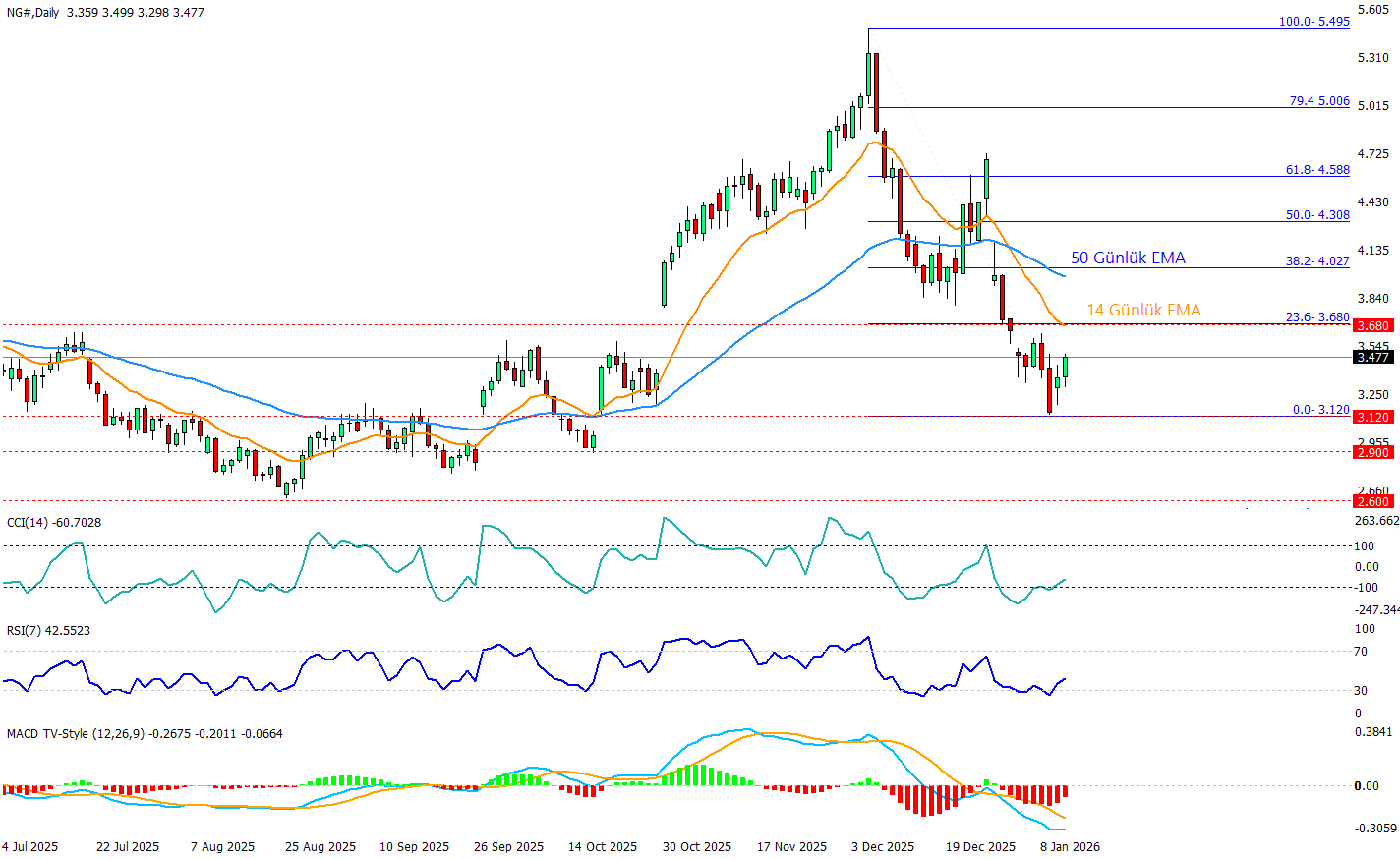 Doğalgaz günlükte Aralık başında 5.495 zirvesi sonrası sert bir düzeltmeyle kısa vadeli trend aşağı döndü. Fiyatın hem 14 günlük EMA’nın hem de 50 günlük EMA’nın altına sarkması satış baskısının halen baskın olduğunu gösterirken, son günlerde 3.12 desteğinden gelen tepkiyle 3.47 civarında toparlanma denemesi görüyoruz. Bu noktada 3.12 altına sarkma durumunda 2.90 ve 2.60 seviyelerine doğru geri çekilme riski artar. Yukarıda ise ilk kritik direnç 3.68 (Fibo 23.6) bölgesi; buranın üzerinde kalıcılık sağlanmadıkça yükselişler tepki niteliğinde kalmaya daha yatkın, 3.68 üstünde ise 4.02 (Fibo 38.2) ve 4.30 (Fibo 50) bandı bir sonraki hedef/direnç alanı olur. Momentum tarafında RSI’ın 50’nin altında olması zayıflığa işaret ederken, MACD’nin sıfır altındaki görünümü düşüş trendini teyit ediyor; buna karşın histogramın dipten toparlanması satış hızının azaldığını, yani tepki yükselişinin beslendiğini gösteriyor. CCI ise -60 seviyesinde olup düşüşün şiddetinin ve miktarını azaldığı ama henüz net bir yükseliş hareketi için net bir izlenimin olmadığı yönünde bir görünüm sergiliyor.