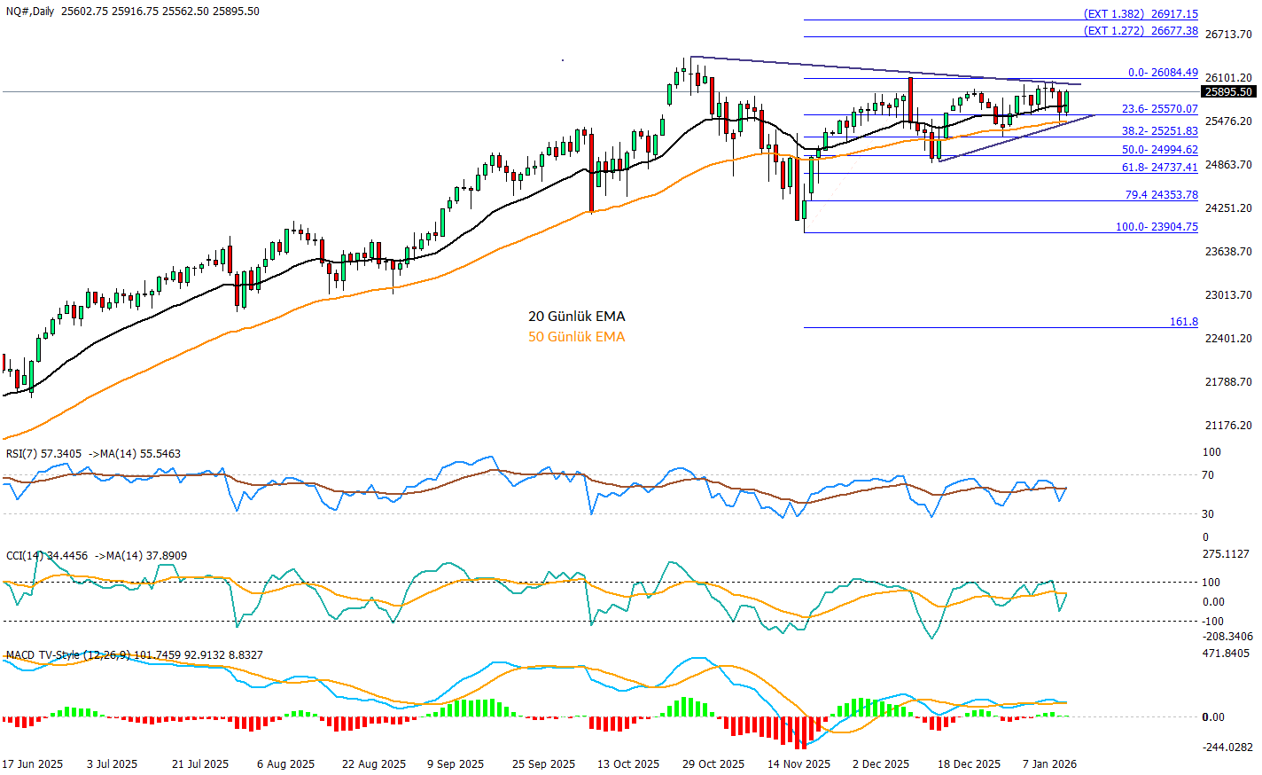 Nasdaq günlük grafikte Kasım ortasındaki sert geri çekilmenin ardından güçlü bir toparlanma yapsada yatay bir seyir izlemekten pek kurtulabilmiş değil. Fiyat şu an 25.900 civarında ve hem 20 günlük EMA’nın hem de 50 günlük EMA’nın üzerinde kalarak kısa-orta vadede pozitif yapıyı koruyor. Ancak son haftalardaki fiyatlama sıkışmaya doğru gidiyor. 26084 yukarı kırılırsa önce 26.677 ve 26.917 Fibonacci uzatma hedefleri gündeme gelebilir, kırılımın kalıcılığı için kapanışların 26084 üstünde oturması kritik. Momentum tarafında RSI 58 ile dengeli-pozitif bölgede, CCI pozitif ama sınırlı, MACD de artıda olsa da yataylaşıyor kısaca göstergeler tarafında net bir ivmelenme görüntüsünü destekleyecek güç görünmüyor denilebilir.