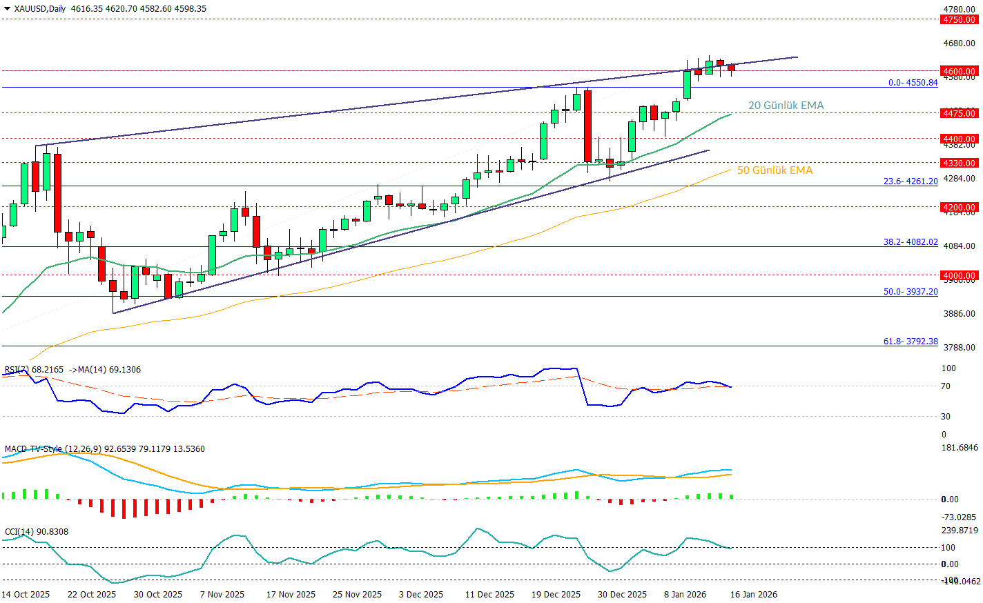Ons altın günlük grafikte yükselen kanal içinde ana trendini koruyor, son rallinin ardından fiyatın 4.600 bölgesinde (psikolojik/ara direnç) oyalanması ve üst banda yakın küçük gövdeli mumlar, zirve denemesi sonrası kısa vadeli nefeslenme gibi bir görünüm yaratmakta. Buna karşın 20 günlük EMA’nın yukarı eğimli şekilde fiyatın altında trend desteğinin canlı olduğunu gösterirken, 4600-4.550–4.475 potansiyel tepki alanları olarak öne çıkıyor. Bu bölge altında kalıcılıkta 4.400 ve 50 günlük EMA çevresi ikinci destek konumuna geçer. Momentum tarafında RSI’ın 70 seviyesinde olması haftanın 3 günündeki yeni zirvelerden sonra bir aşırı alım ortamını işaret etmekte. MACD’nin pozitif bölgede yukarı yönlü görünümü, düzeltmelerin şimdilik “trend içi” kalabileceğine işaret ediyor. CCI tarafıda +100’den aşağı çekilip bir miktar long pozisyonların kapatılması ya da yenileri için bir miktar beklenilmesi anlamına gelen bir görünüm vermeye başlamış durumda.
