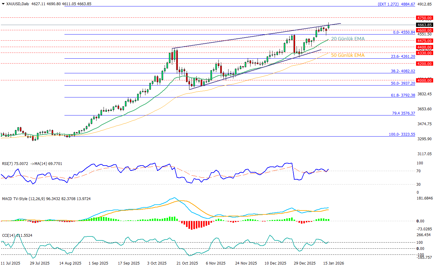 Ons altın günlük grafikte yükselen kanalın üst bandına yaslanmış durumda ve fiyat 4.664 civarında üst kanal çizgisini test ediyor. Son mumlar yukarı denemelerde fitil bırakırken geri çekilmeler 4.600 üstünde karşılanıyor bu da trendin hala güçlü olduğunu ama ivmenin doygunluğa yaklaştığını söylüyor. Teknik tarafta tablo pozitif, fiyat 20 günlük EMA ve 50 günlük EMA’nın belirgin üzerinde, MACD sıfır üstünde yükselişi teyit ediyor ancak RSI 75 ve CCI 100+ bölgede olduğu için kısa vadede kar realizasyonu ihtimalini sıcak tutuyor. Bu yüzden yukarıda 4.750 bandı ana direnç olarak takip ediliyor. Aşağıda ise olası bir düzeltmede 4.600–4.550 ilk kritik destek katmanı olarak izleniyor. Temel tarafta altına ayrı bir yakıt veren şey, Trump’ın Grönland dosyası üzerinden Avrupa’ya dönük ek gümrük vergisi tehdidini masaya sürmesi, ve bu durumun risk iştahını azaltması söylenebilir. Bu belirsizlik ortamını da portföylerde güvenli liman payını artırıp altını yukarı itiyor.