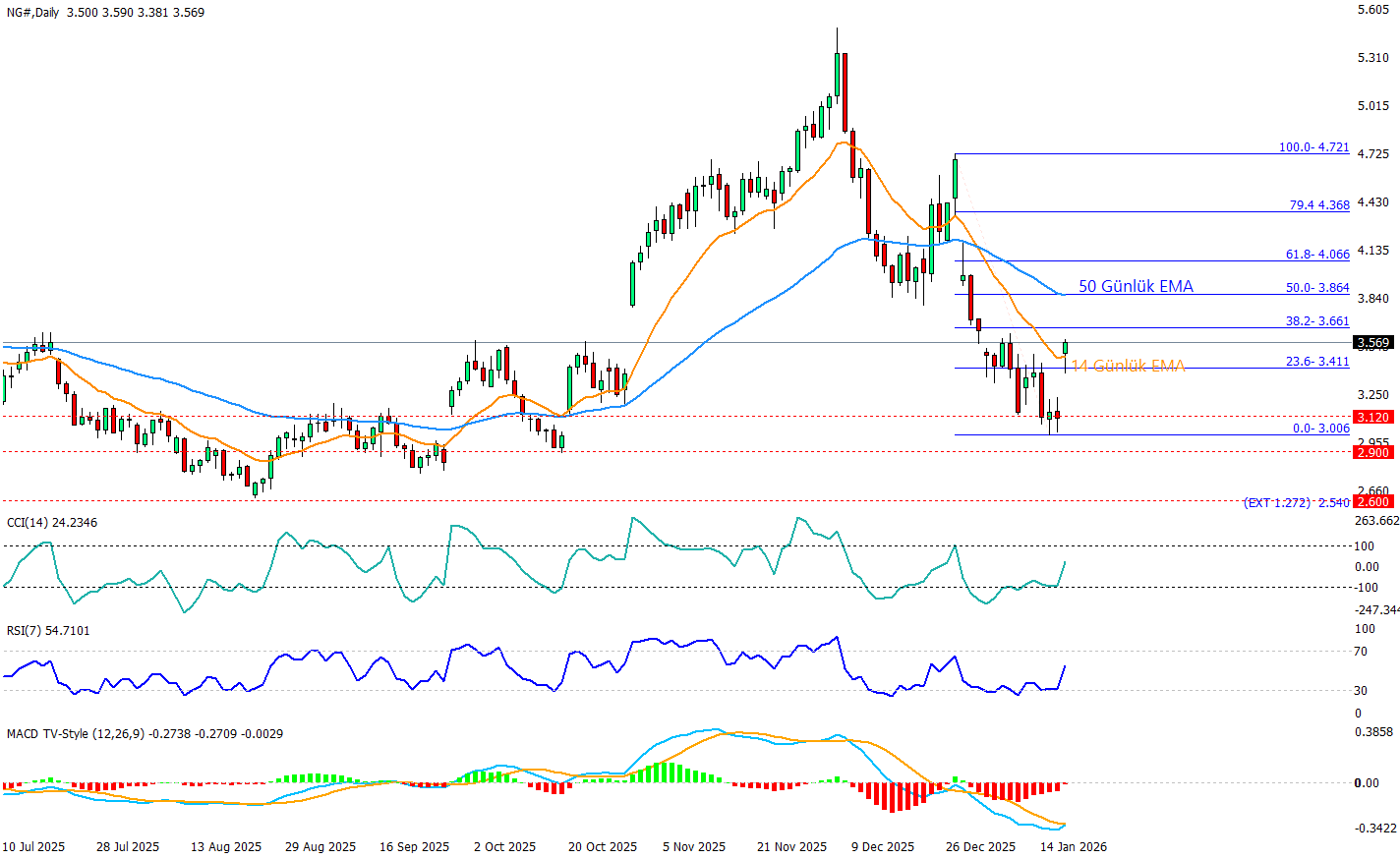 Doğalgazda 3.12–3.00 destek bölgesinden tepki geldiğini ve fiyatın yeniden 3.41 (Fib %23,6) üzerine tırmandığını görüyoruz ve şu an hareket 3.66 (Fib %38,2) eşiğine doğru ilerliyor. Kısa vadede pozitif olan taraf, RSI’nin 55’e toparlanıp nötr-pozitif bölgeye dönmesi ve CCI’nın yeniden artıya geçmesi, bu iki durum satış baskısının azalıp yükseliş momentumunun güçlendiği izlenimini yaratıyor. Buna karşın MACD henüz negatif bölgede olduğu için orta vadeli trendin tam anlamıyla döndüğünü söylemek zor, bu yüzden 3.66 üzeri kalıcılık gelmeden yükselişi düzeltme sınıfında tutmak daha sağlıklı. Yukarıda 3.66 aşılırsa sıradaki bariyer 3.86 (Fib %50) - 50 günlük EMA ve devamında 4.07 (Fib %61,8); aşağıda ise yeniden zayıflamada 3.12 ilk savunma hattı, bunun altı 3.00 ve 2.90 desteklerine doğru alan açar. Makro tarafta fiyatı son günlerde en çok oynatan tema hava tahmini ve arz dengesi diyebiliriz.