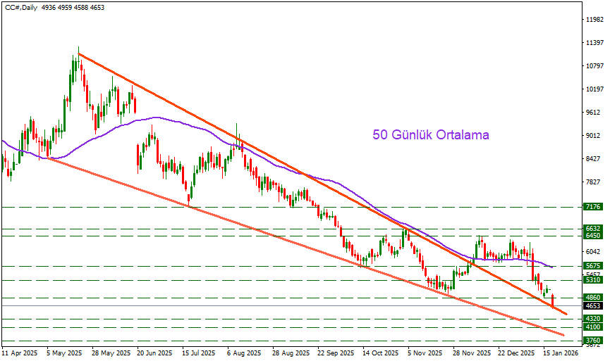 Kakao aşağı yönlü tepkiler almaya devam ettiği taktirde düşüş kanalı içerisine girmesi ile 4320 bölgene doğru satış baskıları güç kazanabilir.