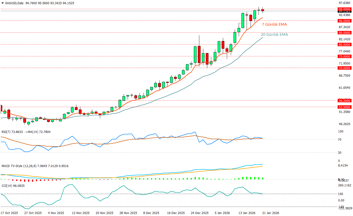 Ons Gümüş günlük grafiğine baktığımızda dün alıcı ve satıcılar kararsız bir görünüm yaratarak doji oluşturmuş durumda ve bugünde özellikle Trump’ın Davos’ta yaptığı konuşma ile birlikte gümüşte satış baskısı artmaya başladı ve mum kırmızıya döndü. Bu Trump’ın konuşmasının beklentilerin aksine görece daha yumuşak kalması piyasaları bir miktar rahatlattı ve buda gümüşte satışı arttırırdı diyebiliriz. Ama günün kalan saatlerinde bu açıklamanın sıcaklığı kaybolduktan sonra alıcılar tekrar devreye girip 95 üstü kapanış yapmak için atağa geçebilir. Çünkü MACD tarafında momentumun gücü kötü değil ve her nekadar grafik yataylaşmaya başlasa da pozitif bölgede seyretmeye devam ediyor.