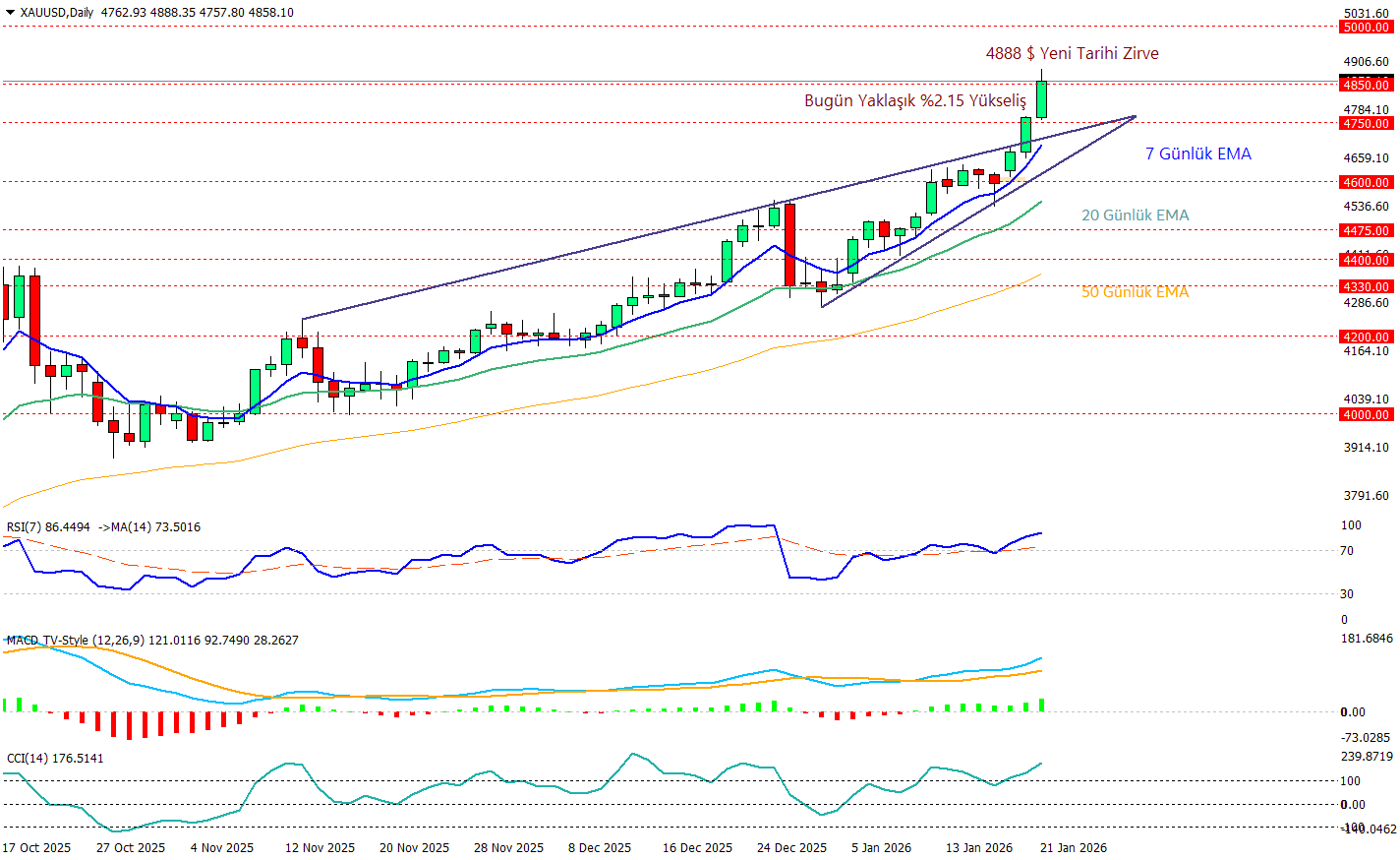 Ons Altın günlük grafiğine baktığımızda bugun %2.15’ e varan çok güçlü bir yükseliş görmekteyiz ve bu yükseliş ile birlikte 4888 dolar seviyesinde yeni bir tarihi zirve yapan altın şuan 4850 seviyesinin üzerinde tutunmaya çalışıyor. Bugün 4850 üstünde kapanışını yapabilirse haftanın kalan günlerinde 5000 dolar hedeflenebilir. RSI 86 seviyesine kadar yükselsede böylesine güçlü trendlerde aşırı alım satım bölgelerinde fiyat düşünülenin aksine fazlaca zaman geçirebilir o sebeple CCI tarafına baktığımızda +177 ile güçlü bir görünüm veriyor. MACD tarafı da sinyal çizgisinden uzaklaşması ve histogramların hacimlenmesi bu ivmeyi teyit ederek yükselişin devam edebileceğine dair bir izlenim yaratmaktalar diyebiliriz.