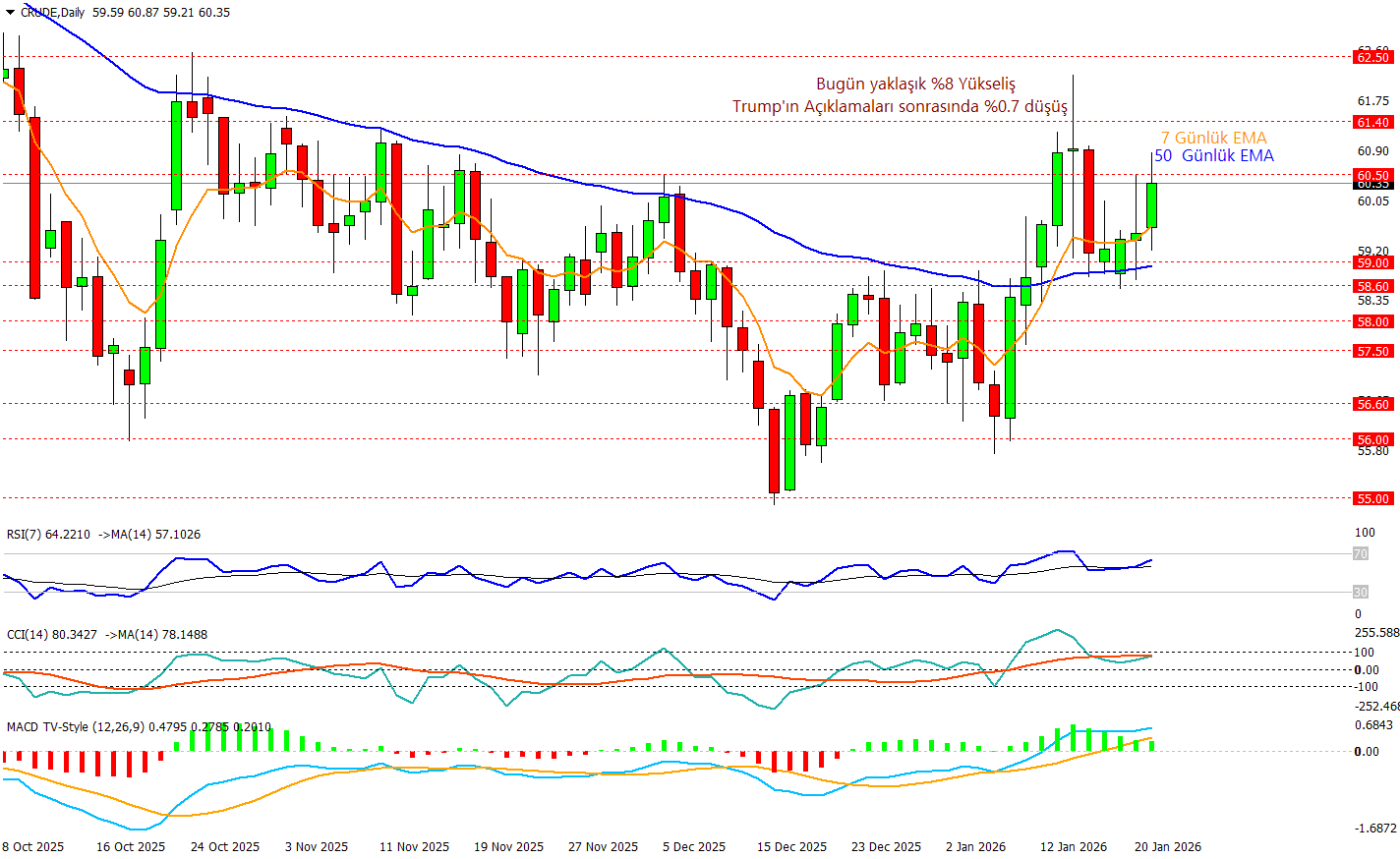 Crude Oil bugün yaklaşık %8 değer kazandı ve fiyatı yeniden 60 üzeri bölgeye taşıdı ve kısa vadede 7 günlük EMA’nın 50 günlük EMA’nın üzerine çıkması momentumun yukarı döndüğüne işaret ediyor. Ancak son yükselişle birlikte fiyatın 60,50–61,40 direnç bandına temas ettiği noktada ivme zayıfladı ve 16:30 sonrası Trump’ın “petrol fiyatları düşmeli” söylemiyle grafikte de not ettiğimiz şekilde yaklaşık %0,7’lik kısmi bir düşüş yaşadı. Göstergeler tarafında RSI 64 ile güçlü bölgede ama 70’e yaklaşırken temkin sinyali veriyor, CCI pozitif kalıyor, MACD ise yükseliş trendinin sürdüğünü söylüyor buna rağmen kısa vadede haber akışıyla gelen satışlar direnç bölgesini daha da kritik hale getirdi. Trump’ın fiyatların düşmesi gerektiğini belitmesi ve bu yönde düzenli açıklamalar yapması fiyatlaın üstünde bir baskı unsuru olarak kalmaya bir süre daha devam edecek.