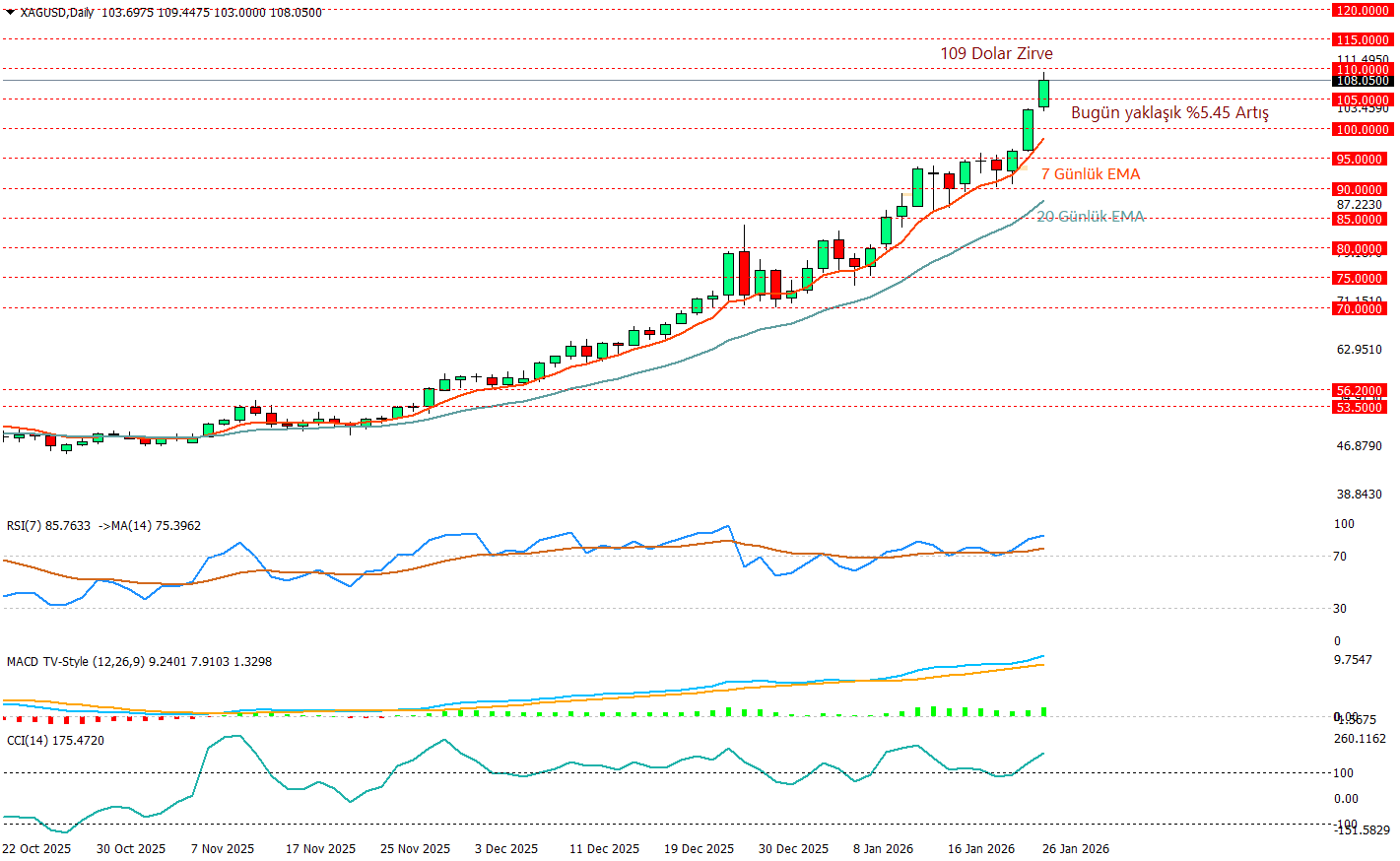 Ons gümüş günlük grafikte güçlü bir yükseliş rallisi yakalamış durumda ve bugün yaklaşık %5,45’lik sert ralliyle 109 dolar seviyesinde yeni zirve yaptı. Fiyatın 7 günlük EMA’nın belirgin şekilde üzerinde kalması ve 7 EMA’nın 20 EMA’nın üstünde hızlanması trendin sağlıklı olduğunu teyit ediyor ancak RSI 86 ve CCI 175 seviyeleri kısa vadede aşırı alım bölgesine işaret ettiğinden, düzeltme ihtimali her geçen an artıyor. Bu görünümde 110 dolar seviyesi test edilmeye çok yaklaştı. Bu seviyeyi kırıp üstünde yapılacak bir kapanış ile hali hazırda güçlü momentumun varlığı ile birlikte 115 ve 120 dolar seviyeleri hadef olarak takip edilebilir.
