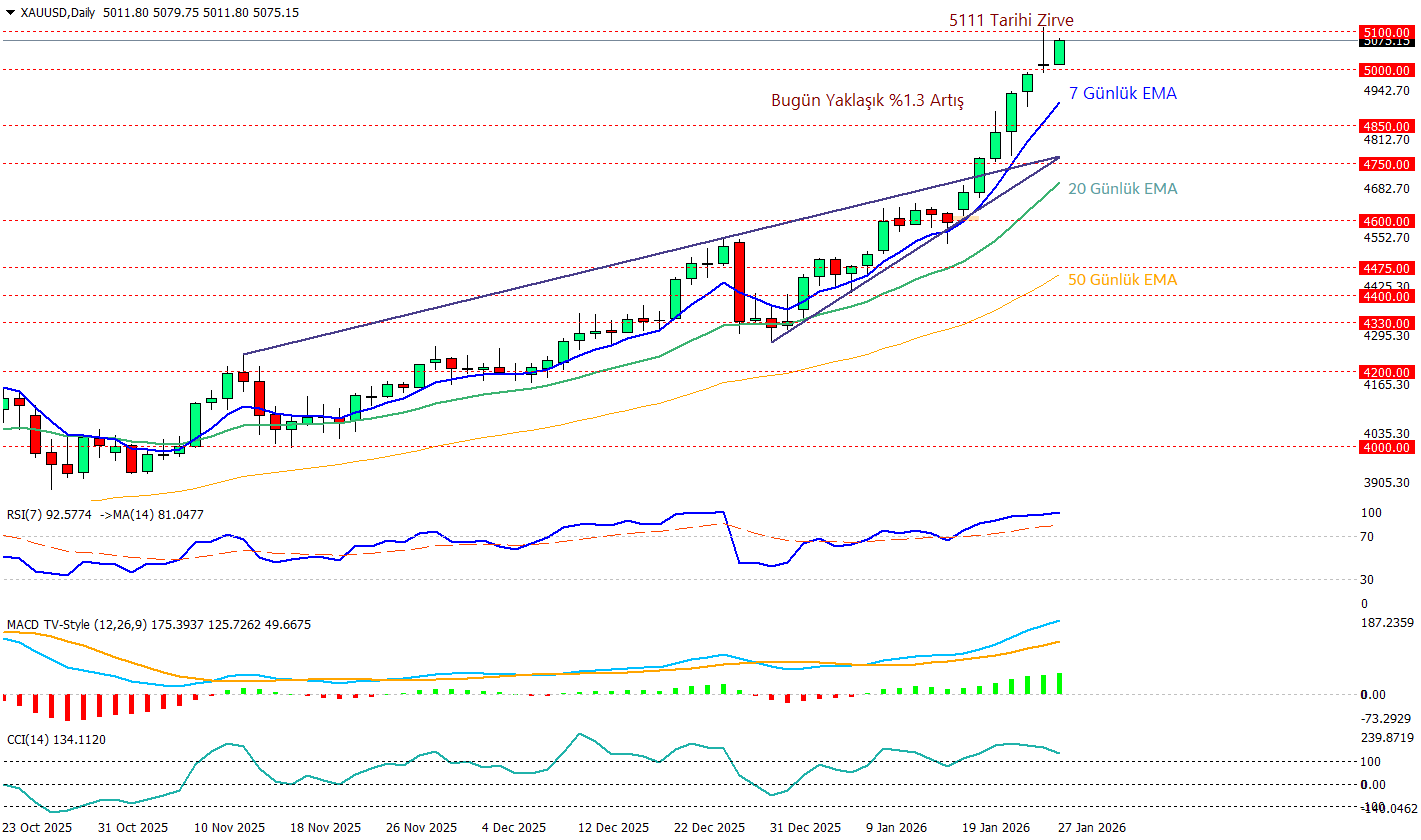 Ons altın günlük grafiğini incelediğimizde dün yeni bir tarihi zirce olan 5111 dolar seviyesi görüldü. Sonrasında buradan gelen satış baskısı ile fiyat tekrar güne başladığı seviyeye kadar geri çekilip kapanış yaptı. Bugünde şuana kadar %1.30 artan altın tekrar 5100 direncini test etmek için hazırlanıyor. MACD tarafında grafiğin eğimi gittikçe yükselerek artıyor ve histogramlarda büyüyor bu durum momentum tarafında sağlıklı bir görünüm vererek fiyattaki yükselişin sağlıklı olduğu izlenimini veriyor. CCI tarafında grafik aşağı eğimli bir vaziyette ama hala +100 sınırının üstünde kalmaya devam etmesi uzun pozisyonların kapanışı için hala bir vakit olabileceğini gösteriyor. RSI tarafında da 92 ile aşırı alım bölgesinde olunup bu seviyelerin tarihte az görülmesi sebebiyle net bir düzeltme gelebileceği konusunda önemli bir uyarı görünümü veriyor.