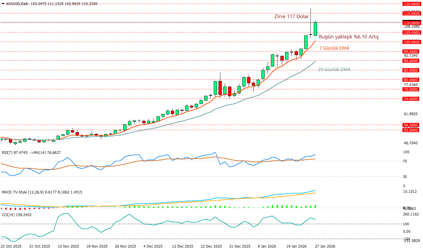 Ons Gümüş günlük grafiğine baktığımızda dün gümüş 117 Dolara kadar yükselmiş ve tarihi zirve yapmıştı ancak sonrasında bütün bu yükselişi geri verdi ve güne başladığı seviyelerde bitirdi. Bugün de şuana kadar yaklaşık %6.10 yükselmiş vaziyette ve 110 dolar civarından işlem görüyor. 7 Günlük EMA fiyatı yakından takip ediyor. MACD tarafında ise sinyal çizgisi üstünde seyir yükselerek devam ediyor ve buda fiyatın yükseliş devamlılığı için iyi bir izlenim vermekte. RSI 87 seviyesinde bulunarak aşırı alım sinyali üretirken dünkü gibi 120 dolar civarlarından gelen satış baskısı gibi bir baskı tekrarlanırsa bir düzeltme hareketinin başlayabileceğini gösteriyor diyebiliriz. Fiyat şuan 110 dolar seviyesini test ediyor ve günün erken saatlerinde burayı geçiğ bir sonraki seviye olan 115 doları hedeflesiğini görebiliriz çünkü momentum tarafı güçlü kalmaya devam ediyor.