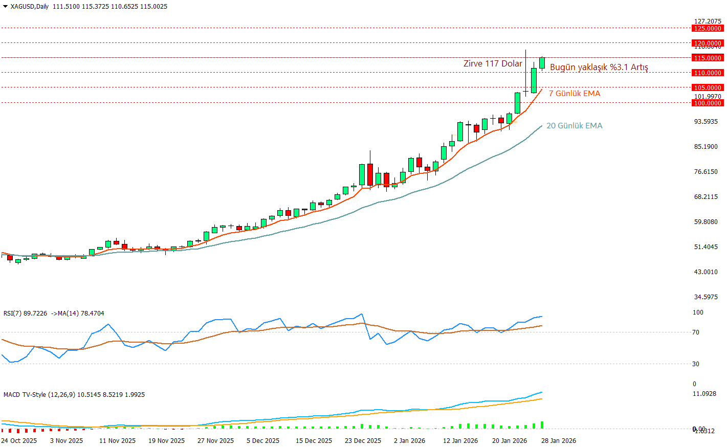 Ons gümüş günlük grafikte fiyatın yeniden 115 dolar seviyesini test etmeye başladığını görmekteyiz. Bugün yaklaşık olarak %3.1 artış gösteren gümüş 5 gündür yükseliyor. Bugün FED faiz kararı ile birlikte tekrar 117 dolar olan zirvesini geliştirebilir ve 120 doları test edebilir. 7 Günlük EMA fiyatı yakından takip edip dinamik bir destek alanı oluşturuyor. Göstergelere baktığımızda RSI 89 seviyesinde bulunarak aşırı alım sınırının epey üzerinde seyrediyor ve bu durumda 120 dolar seviyelerinde bir düzeltme olabileceği ihtimalini canlı tutuyor. MACD tarafı da pozitif bir görünüm sergilemekte ve momentumu teyit ediyor. 120 dolar seviyesi testi ve sonrasındaki ivmenin devamı bugünkü FED toplantısı ve ardından ABD teknoloji devlerinin açıklayacakları çeyreklik sonuçların negatif gelmesi ihtimaline göre artabilir.