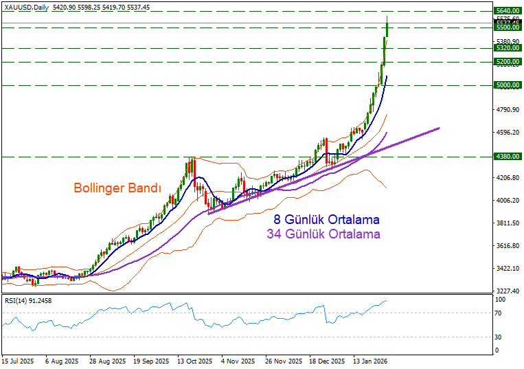 RSI indikatörü 91’li seviyelerde aşırı alımı gösterirken yükselişler bollinger bandın üst çizgisini aşıyor.