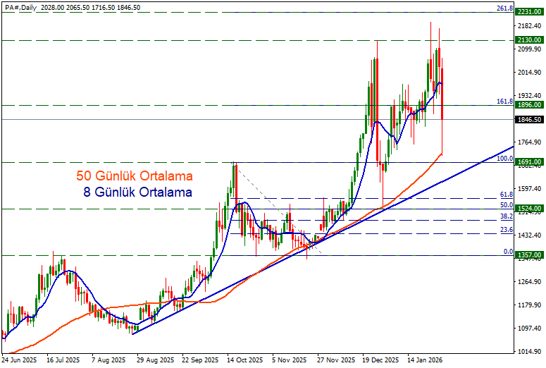 Fiyatlamalar şu sıralar gün içi dip seviyeden hafif toparlanarak 1846 bölgesinde işlem görüyor. Paladyumda aşağı yönlü hareketlerin devam etmesi durumunda fibonacci 100 seviyesine denk gelen 1691 bölgesi önemli bir destek olarak test edilecek. Bu bölgenin altına inişlerde 1500’lü seviyelerin gündeme gelmesi olası olabilir.