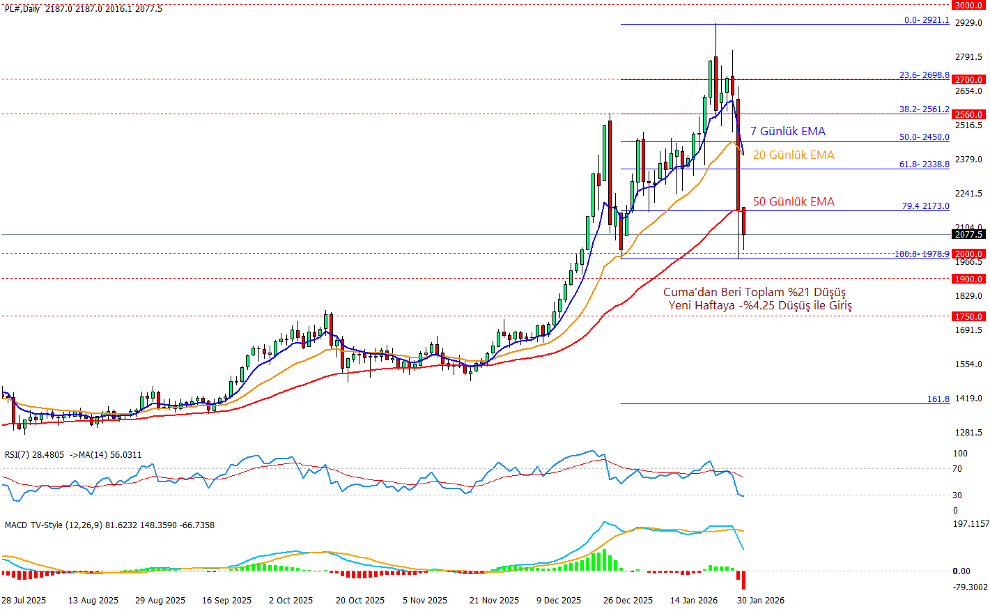 Platin tarafında günlük grafikte CME Group’un teminat oranlarını artırmasının tetiklediği kaldıraç çözülmesi ile Cuma gününden beri satışların sertleştiğini ve platin fiyatının bu dalgadan payını aldığını gösteriyor, grafikte de vurgulandığı üzere Cuma’dan bu yana toplam yaklaşık %21 geri çekilme görülürken yeni haftaya da -%4,25 düşüşle başlanmış. Bu sert geri çekilme fiyatı kısa vadede 7,20 ve 50 günlük EMA’ların altına iterken, momentum tarafında RSI 28,8 ile aşırı satım bölgesine sarkmış durumda bu da alımların kısa vadede gelebileceği izlenimini yaratıyor. Teknik olarak yukarıda 2175 (79,4 fib) ilk direnç eşiği olurken, devamında 2340 (61,8) ve 2450 (50,0) bandı daha güçlü direnç alanı olarak izlenebilir, aşağıda ise 2000 psikolojik seviyesi ile 1900 bölgesi kısa vadeli ana destek konumunda. Göstergelerde ise MACD tarafında sinyal çizgisi aşağı yönlü kesilmiş ve histogramlar negatif bölgede hacimleniyor buda satışların bir miktar daha sürebileceği bir pencere yaratıyor. RSI her ne kadar aşırı satım bölgesine yeni girmiş olsada MACD tarafında negatif momentum alışları bir miktar geciktirebilir.
