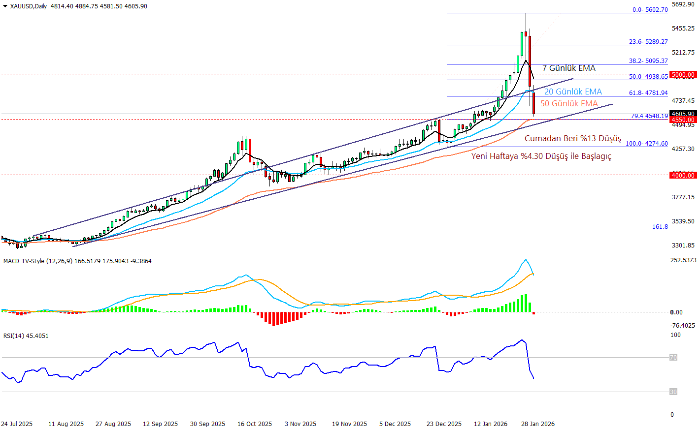 Teknik görünümde ise Altın’da Cuma’dan bu yana %13’e yaklaşan geri çekilme ve yeni haftaya -%4,30 düşüşle başlama sonrası fiyatın 4653 bölgesine kadar indiği görülüyor. Fiyat şuanda 4550 dolar seviyesine doğru sarkıyor ve bu seviyeye 50 günlük EMA’da denk geliyor. Buradan bir tepki alabilirse 4780’e doğru yönelme ihtimali var. Göstergelerde ise RSI 46 ile momentumun zayıfladığını ama tamamen çökmüş bir yapıya dönmediğini gösteriyor, MACD tarafında da ivme kaybı belirginleşmiş durumda. Ancak Önemli bir nokta ise fiyat, geri çekilmeye rağmen aylar öncesinden gelen yükseliş kanalının içine yeniden dönmüş görünüyor bu da orta–uzun vadede trendin tamamen bozulmadığı ve yapının sağlıklı düzeltme üzerinden yeniden denge aradığı ve yine orta-uzun vadeli sağlıklı bir yükseliş için zemin oluşturduğu söylenebilir.