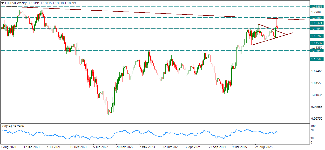 EURUSD paritesi iki hafta önce sıkıştığı üçgenden çıkıp 1.2080’e kadar tepki vermişti. Ancak 1.2080’i gördüğü haftalık mumu düşüş yönünde kapattı ve yeni haftada da düşüş, yani dolar lehine hareket devam ediyor. 1.18’in altına inerse paritedeki eğilim dolar lehine dönebilir. Üçgenin alt bandını trend çizgisi olarak alırsak, 1.18’in altındaki düşüş eğilimleri 1.16’ya kadar derinleşebilir.