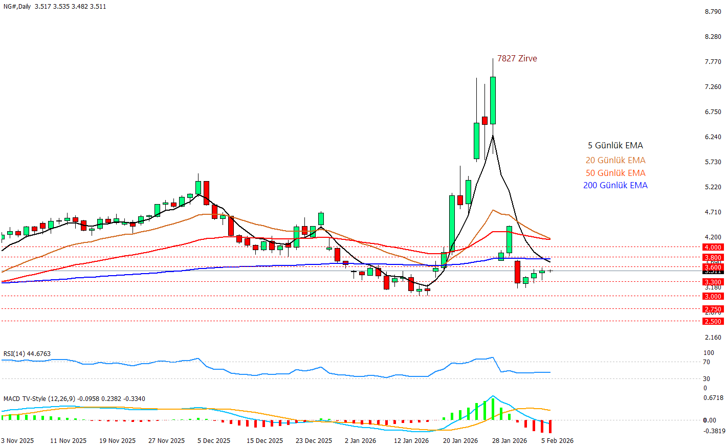 ABD doğalgazında fiyatları son günlerde yukarı taşıyan ana katalizör, EIA verisinde 30 Ocak haftasında -360 bcf ile tarihin en büyük haftalık stok çekilişinin görülmesi oldu bu rakam mevsim normali olan -190 bcf’nin çok üzerinde ve piyasaya arz sıkılaşıyor mesajı verdi. Soğuk hava dalgası ısıtma talebini artırırken, aynı zamanda bazı bölgelerde donma kaynaklı üretim kesintileri fiyatları desteklemeye başladı ama geçen haftaki kayıpları telafi edebilecek seviyede bir destek değil bu. Fiyat 200 günlük ortalamanın üzerine çıkmadıkça yukarı yönlü net bir yükseliş beklentisi içinde olmak riskli çünkü 5 günlük ortalama an itibariyle 200 günlük ortalamayı aşağı kesmiş durumda. Bu da kısa vadeli görünümün pek parlak olmadığı izlenimini arttırıyor. MACD tarafında da durum parlak değil ve negatif yönlü momentum artışı hız kesmiş görünmüyor. RSI ise nispeten yatay bir görünüm sergileyerek fiyatlama gücü konusunda piyasada net bir görüşün henüz oluşmadığı bir görünüm sergiliyor diyebiliriz.