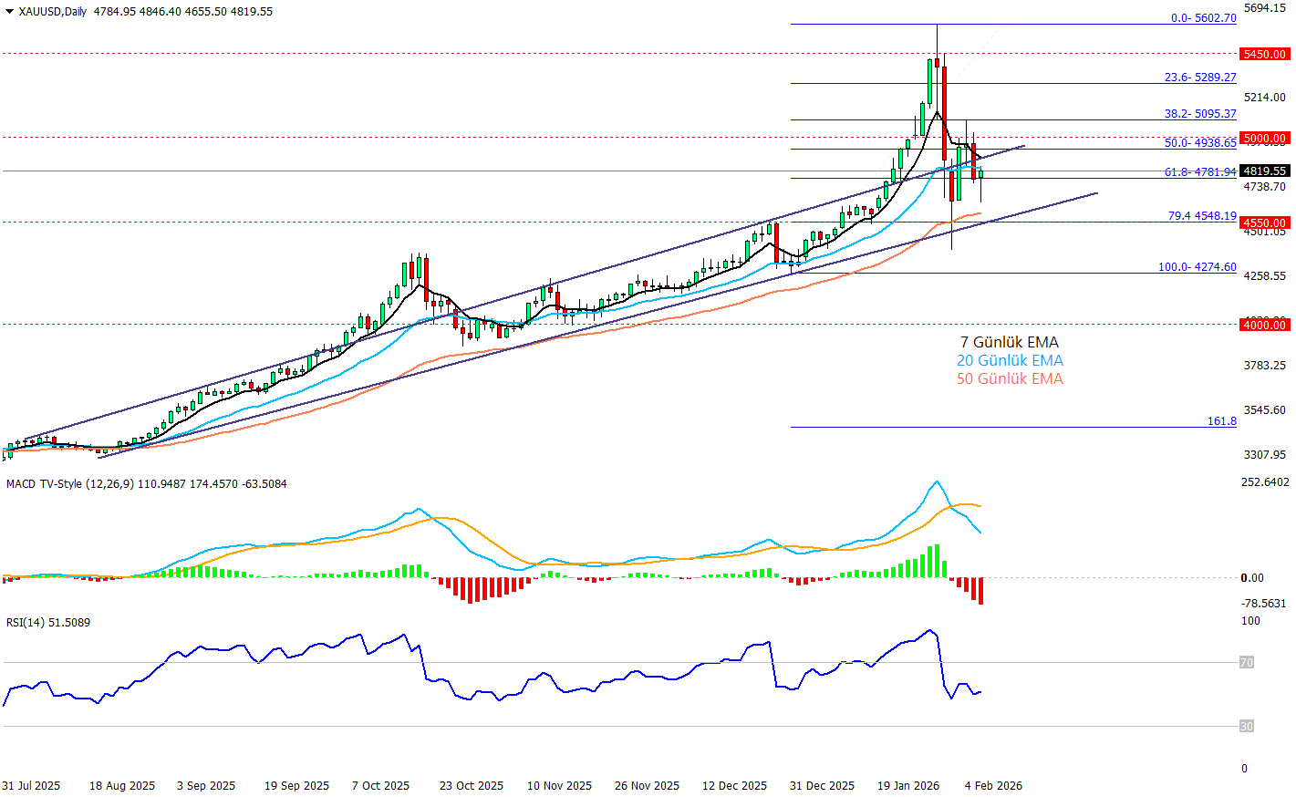 CME’nin COMEX altın kontratlarında teminatı yeniden artırmasıyla tetiklenen “kaldıraç çözülmesi” sonrası ons altında gecenin ilk saatlerinde sert bir geri çekilme görsek de, grafikte fiyatın 4.655$ dip bölgesinden toparlanarak yeniden 4.825$ civarına tutunduğu izleniyor. Bu toparlanmada 61,8 Fibonacci seviyesinin üzerine geri dönüş ve kısa vadeli ortalamalara doğru toparlanma dikkat çekerken, ana resimde 4.940–5.000$ bandı (50,0 fib ve psikolojik seviye) yeniden güçlü direnç alanı olarak öne çıkıyor, bu bölge aşılmadıkça yükselişlerin “tepki” karakteri baskın kalabilir. Momentum tarafında RSI 52 ile nötr-pozitif bölgede denge arayışı sürerken, MACD’de negatif histogram kısa vadede yukarı hareketlerin hala kırılgan olabileceğini söylüyor. Aşağıda 4.780 ilk destek, bunun altında 4.550 ve 4.275 (100 fib) bandı daha kritik savunma hattı, yukarıda ise 4.938–5.000 üzerindeki kalıcılıkta 5.100 ve 5.290seviyelerine doğru alan açılabilir.