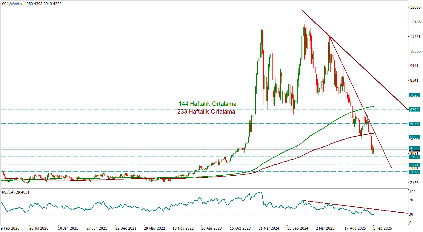 Fiyatın 144 ve 233 haftalık ortalamaların altına sarkmış olması, teknik görünümü zayıflatıyor. Bu bölge artık 5.845 – 6.740 bandı içinde güçlü bir direnç alanı olarak izlenmeli. Bu seviyelerin altında kalındığı sürece yükselişlerin teknik tepki niteliğinde kalma riski yüksek.