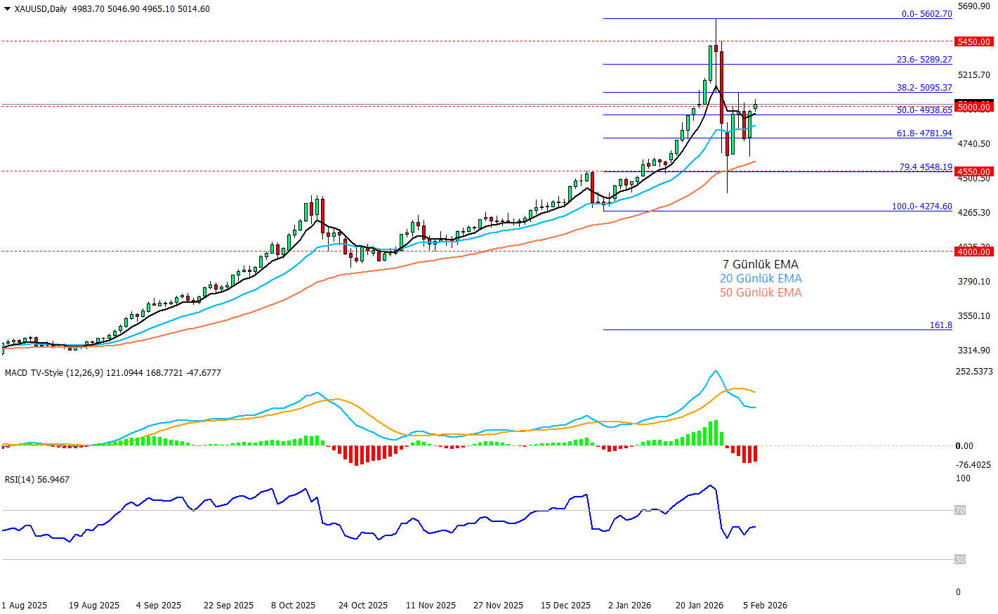 Teknik görünümde ise sert düşüş sonrası düzeltme ve yatay dengeleme öne çıkıyor diyebiliriz . Fiyat yeniden 5.000$ üzerine toparlansa da ivme tam güçlenmiş değil. RSI 56 ile pozitif bölgede ancak MACD histogramının negatifte kalması kısa vadede momentumun kırılgan olduğunu söylüyor. Grafikte 4.940 (Fib %50) ilk önemli destek, altına sarkmada 4.780 (Fib %61.8) destek olarak izlenebilir. Yukarıda ise 5000 psikolojik seviyesi ve 5.095 (Fib %38.2) bölgesi kritik öneme sahip.