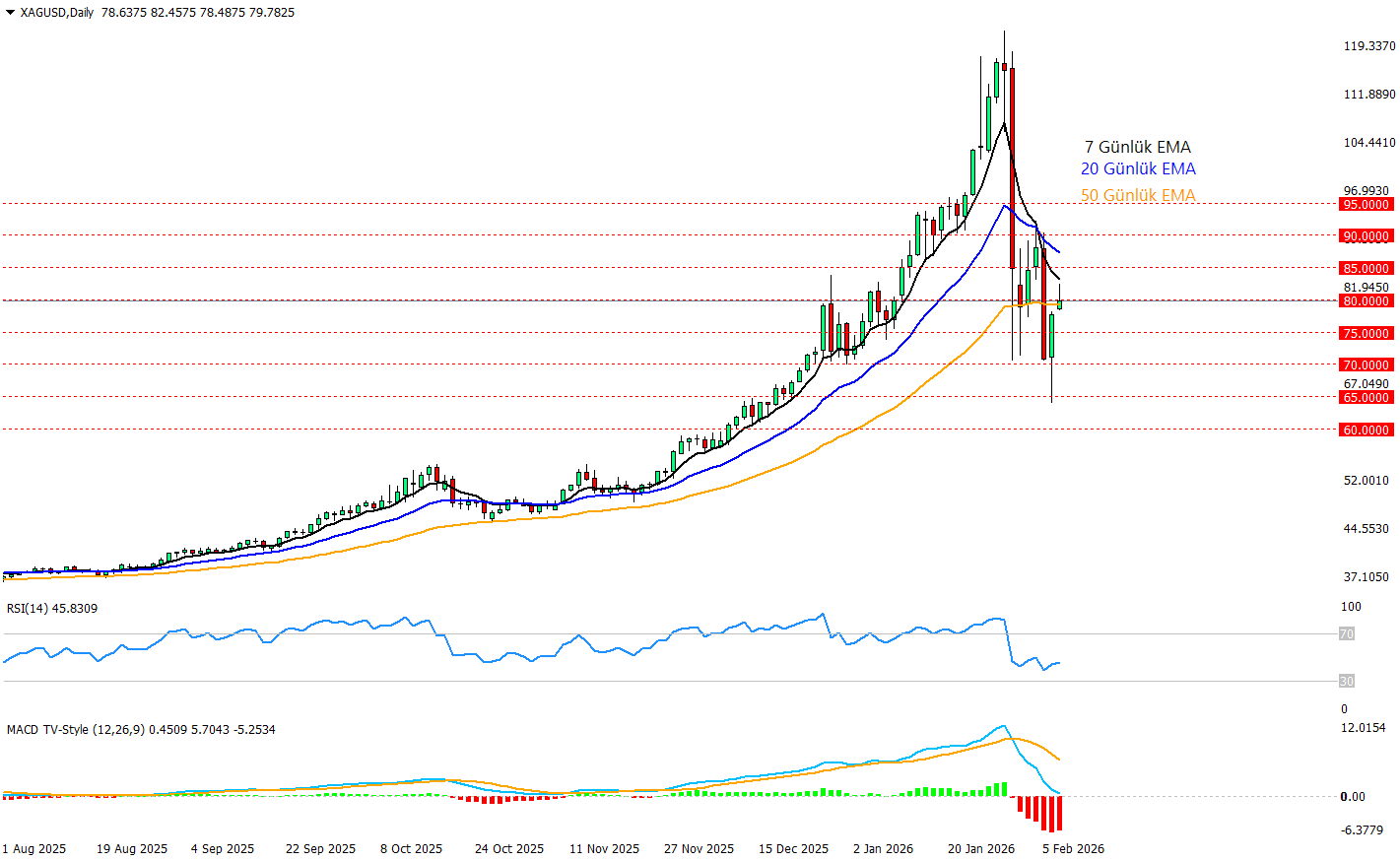 Teknik görünümde ise sert ralli sonrası gelen düzeltmenin etkileri hala hissediliyor, fiyat yeniden 80$ çevresine toparlansa da 20 günlük EMA’nın altında kaldığı için yükselişler şimdilik tepki karakterinde. RSI 46 ile nötr-alt bölgede MACD tarafında negatif histogram ve düşmeye devam eden grafik ise momentumun zayıf olduğunu söylüyor. Yukarıda 80.00 ilk eşik bunun üzerinde kalıcılıkta 85.00 dirençleri izlenir. Aşağıda ise 75.00 kısa vadeli ana destek, kırılması durumunda 70.00–65.00 bandına doğru baskı yeniden artabilir.