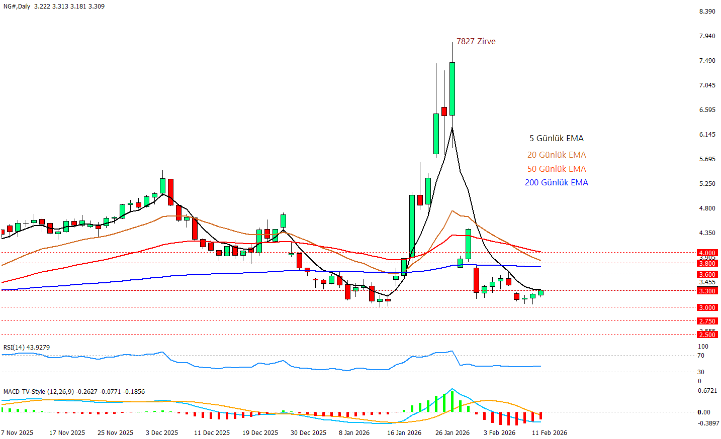 Doğalgaz tarafında son haftalardaki sert volatilite sonrası fiyatın yeniden denge aradığı bir süreç izliyoruz. Grafikte görüldüğü üzere fiyat hala kısa ve orta vadeli ortalamaların (özellikle 20/50 günlük EMA’ların) altında seyrettiği için ana resimde toparlanma isteği olsa da trend tarafında tam rahatlama oluşmuş değil. Bu çerçevede piyasa, bir yandan önceki sert düşüşün ardından dip bölgesini test ederken, diğer yandan yukarı yönlü tepkilerin kalıcı olup olmayacağını tartıyor ama netlik yok çünkü son günlerdeki mumlar oldukça hacimsiz bir görünüm sergiliyor.