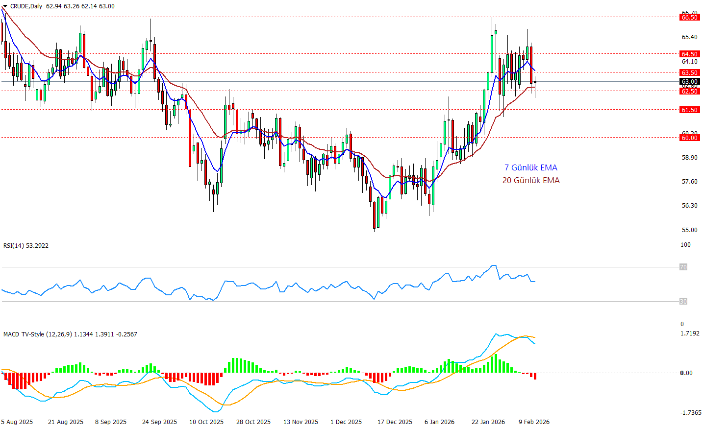 Crude Oil-WTI günlük grafikte diplerden başlayan toparlanma hala bozulmuş değil ama son atakta 66,50 bölgesinden gelen reddin ardından fiyatın 63,50–64,50 bandında yorulup 62,50–çevresine geri çekilmesi, kısa vadede kâr realizasyonu ve konsolidasyon fazına geçildiğini gösteriyor; 7 günlük EMA 20 günlük EMA’nın üzerinde olsa da aradaki farkın daralması ve MACD histogramının eksiye dönmesi ivmenin zayıfladığını, RSI’nin 50’ler civarında kalması ise trendin tamamen çözülmediğini söylüyor. Bu tabloda 62,50 ilk kritik destek, altındaki günlük kapanışlarda 61,50 hattına doğru düzeltme derinleşebilir yukarıda yeniden güç kazanımı için önce 63,50 üstünde tutunma, ardından 64,50 üzeri kapanışlar şart ve bu gerçekleşirse tekrar 66,50 tepe bandı gündeme gelir. Makro tarafta son günlerde fiyatlamayı aşağı çeken ana tema arz rahatlığı oldu. OPEC+ cephesinde Nisan’dan itibaren üretim artışlarına geri dönülebileceği beklentisi ve ABD’de EIA verilerinde ham petrol stoklarının güçlü artış göstermesi arz fazlası algısını büyüterek yükselişi törpüledi buna karşılık Orta Doğu’da ABD–İran hattındaki belirsizlik zaman zaman risk primi yaratsa da anlaşma ihtimali söylemlerinin öne çıkması bu primi geri aldırabiliyor.