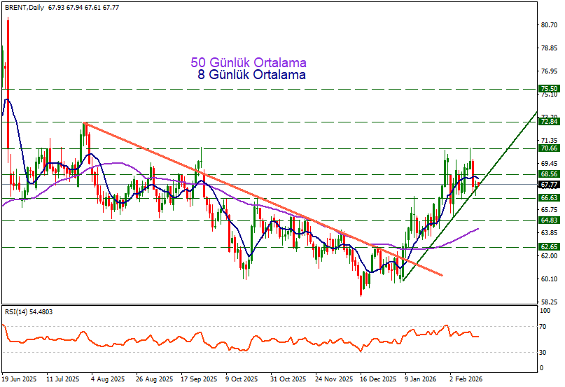 Asya seansındaki hafif negatif işlemlerin ardından anlık olarak 67.77 bölgesinde işlem gören brent petrolde aşağı yönlü baskıların yükseliş trendini aşağı yönlü kırması durumunda 66.63 desteğine doğru düşüşler derinleşebilir. Yukarı yönde ise 68.56 bölgesi direnç oluşturabilir.