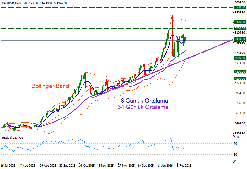 Ons altın aşağı yönlü baskılarla 5000 bölgesinden uzaklaşmadığı taktirde bu bölge destek oluşturmaya devam edebilir. Ek olarak bu destek bölgesi fibonaccinin merkezinde 8 günlük hareketli ortalama ile kesişiyor. Bundan dolayı tepkilerin yönü ve şiddeti kritik olacaktır.
