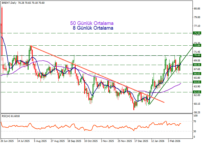 Hafta içerisinde yükseliş trend çizgisini aşağı yönlü kırarak 66.63 destek bölgesini test eden brent petrol, ABD-İran arasındaki jeopolitik belirsizlikler eşliğinde geçtiğimiz gün yukarı yönlü tepkileri güçlendirerek tekrar yükseliş trend çizgisinin üst bölgesine çıktı.