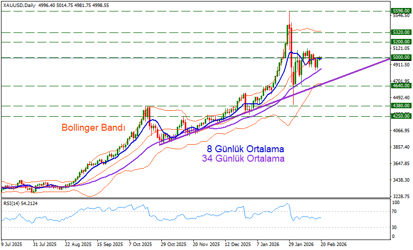 Ons altın hafta içerisindeki düşüş denemeleri sonrasında tekrar 5000 barajına yerleşti. Bu bölge aynı zamanda bollinger bandı merkezi ve 8 günlük hareketli ortalama ile kesişiyor.