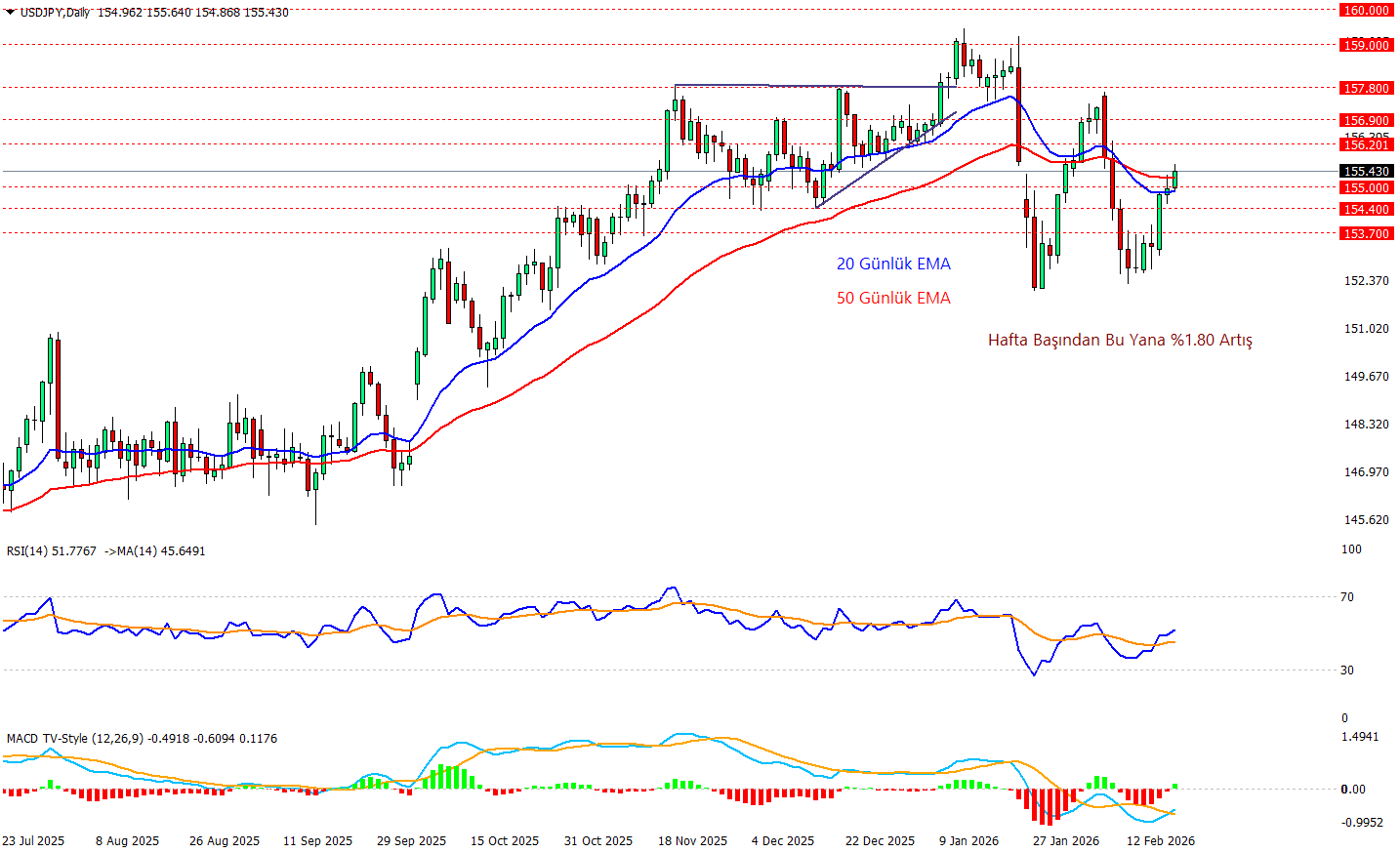 USDJPY’de son haftalarda sert dalgalanma sonrası bu hafta başından beri %1.80 yükselerek yeniden 155,00–156,20 bandında denge arıyor. Grafikte fiyat şu an yaklaşık 155,44 civarında ve dikkat çeken nokta, kısa vadede fiyatın tekrar 20 ve 50 günlük EMA’ların üzerine çıkması oldu. Yani orta vadeli yapı görünümü pozitife döndü denilebilir. Son hareketlere bakınca 157 bölgesinden gelen sert satış sonrası bir toparlanma süreci var.